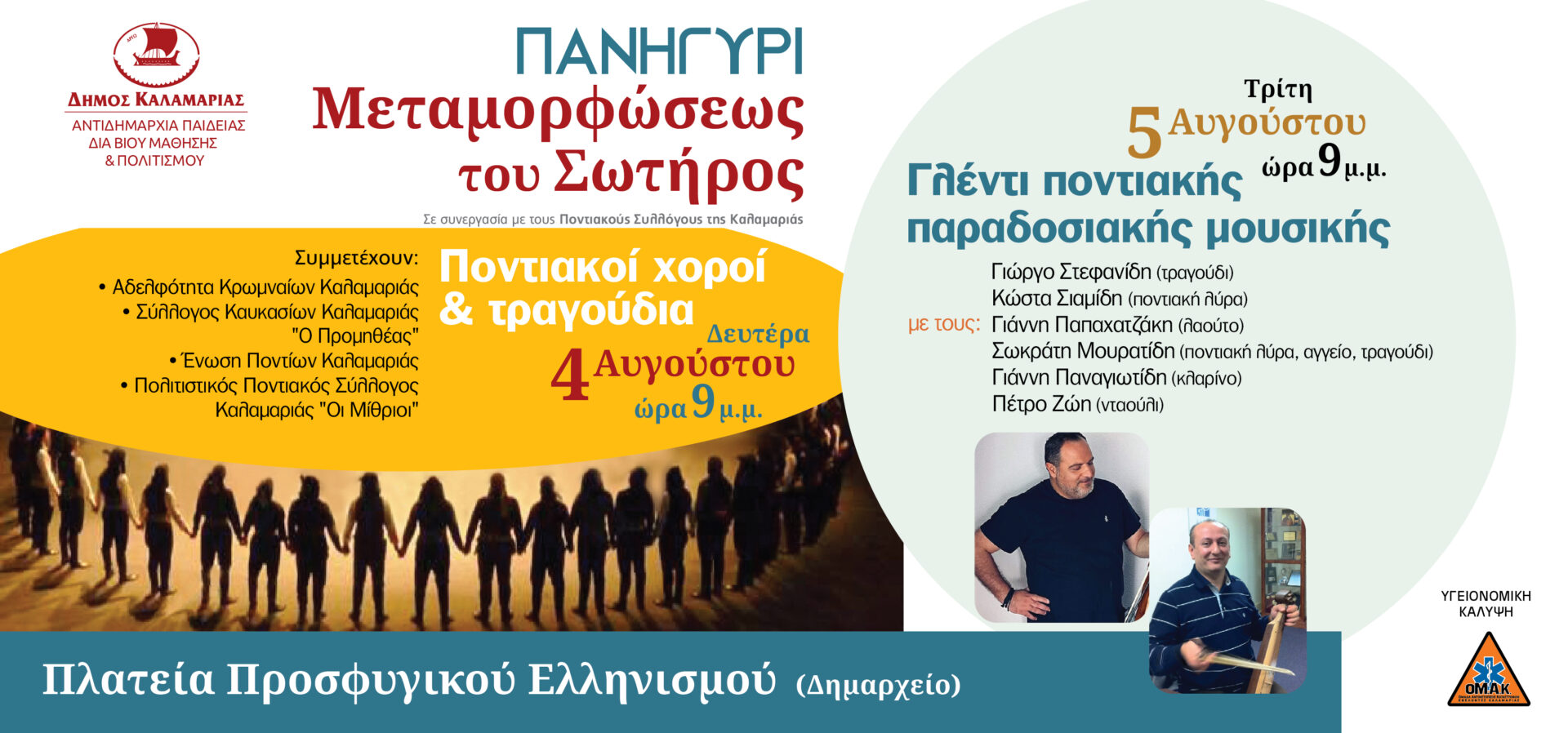 Ο Δήμος Καλαμαριάς τιμώντας όπως κάθε χρόνο τη μεγάλη θρησκευτική εορτή , διοργανώνει και φέτος ένα διήμερο εκδηλώσεων αφιερωμένο στην ποντιακή παράδοση και κληρονομιά της πόλης μας.