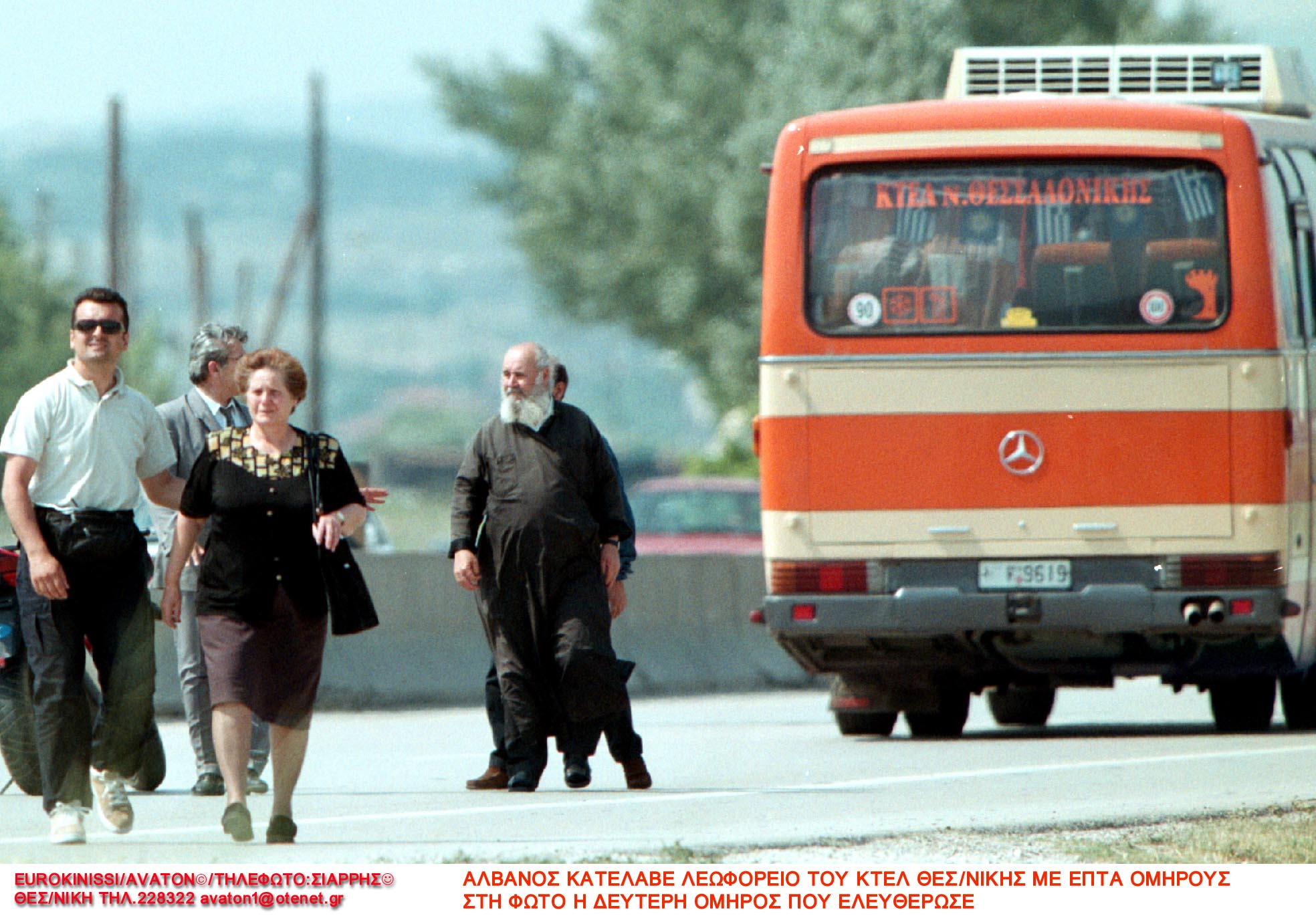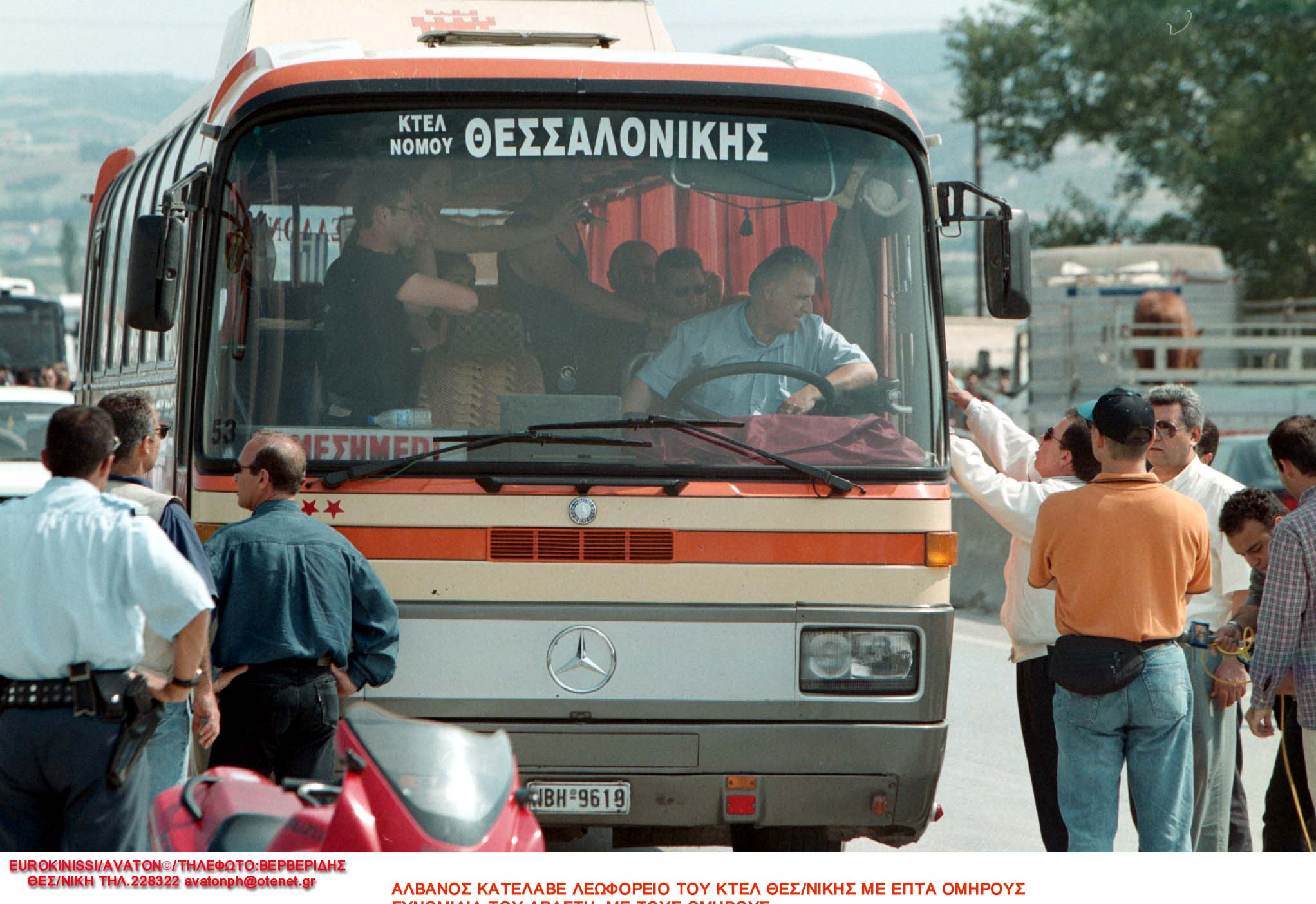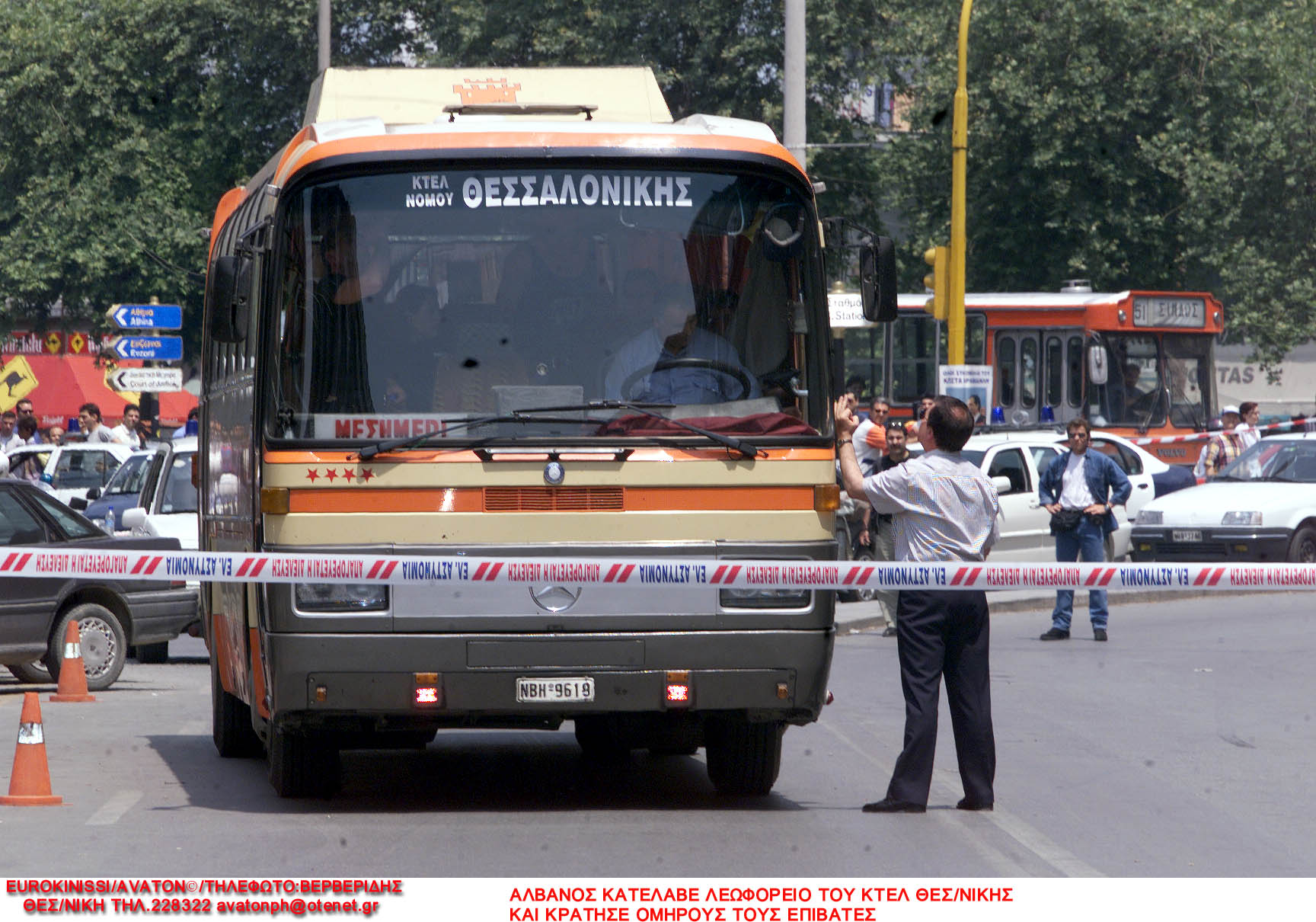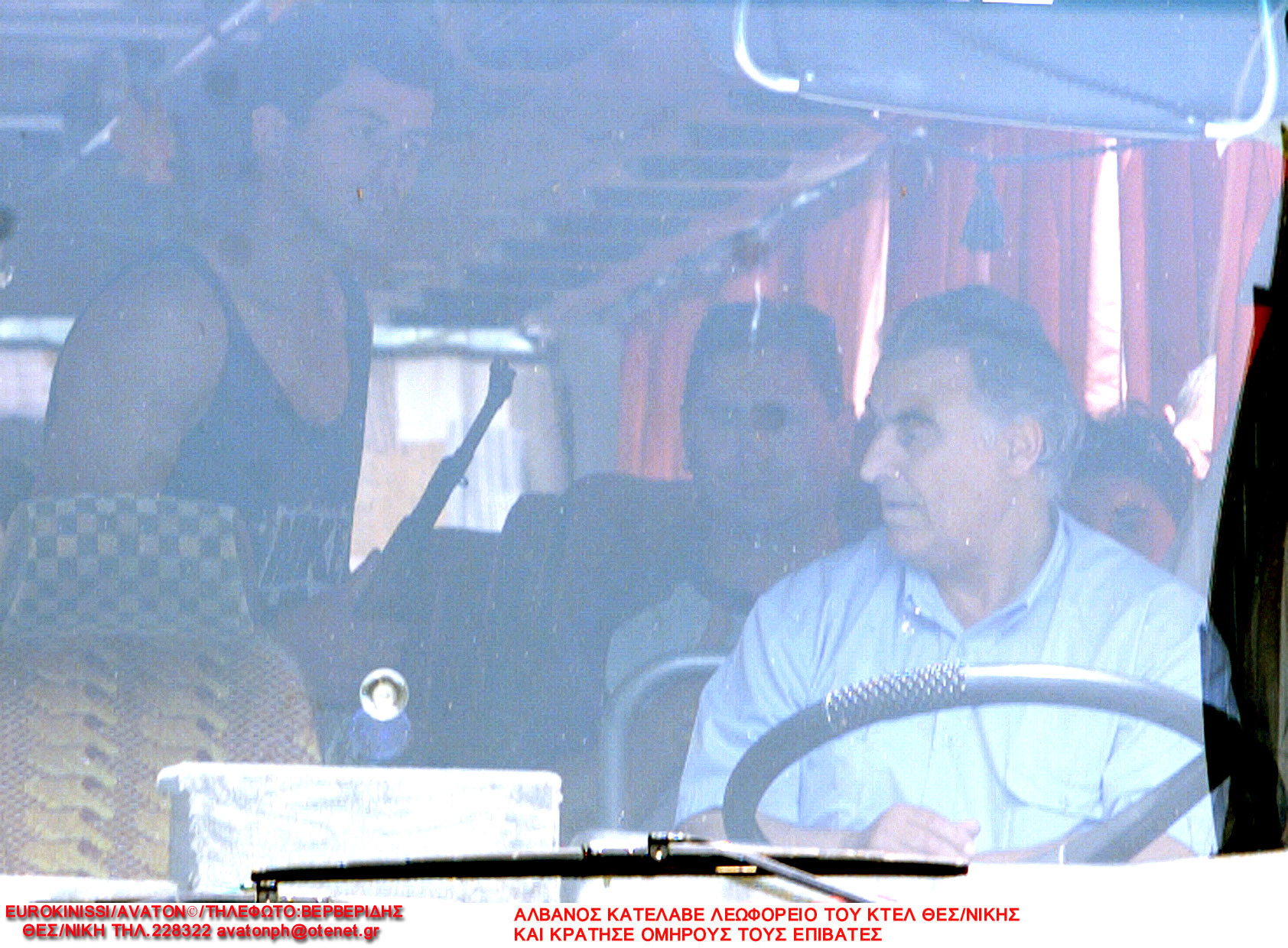Ο 25χρονος Αλβανός μετανάστης Φλαμούρ Πίσλι κατέλαβε λεωφορείο του ΚΤΕΛ Θεσσαλονίκης στο Κάτω Σχολάρι, κρατώντας εννέα επιβάτες ομήρους.