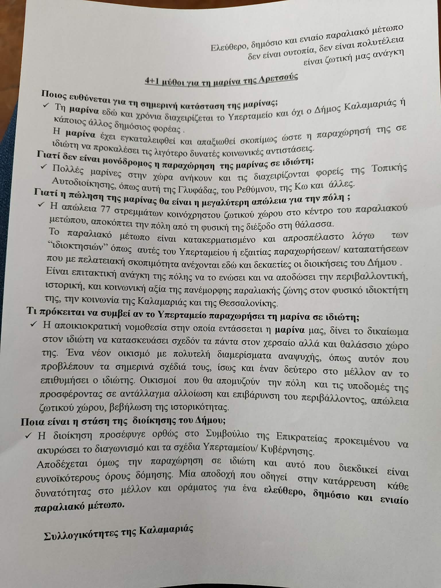 «Οι επιλογές του Υπερταμείου για την υπερδόμηση της Μαρίνας και το real estate έχουν τεκμηριωμένα απορριφθεί ως λανθασμένες μέσα από επανειλημμένες αποφάσεις του Δημοτικού Συμβουλίου Καλαμαριάς, της Μητροπολιτικής Επιτροπής Θεσσαλονίκης της Περιφέρειας Κ. Μακεδονίας, από πλήθος κοινοβουλευτικών ερωτήσεων, αλλά και από την ίδια την τοπική κοινωνία, η οποία έχει εκφράσει ξεκάθαρα τη διαφωνία της.