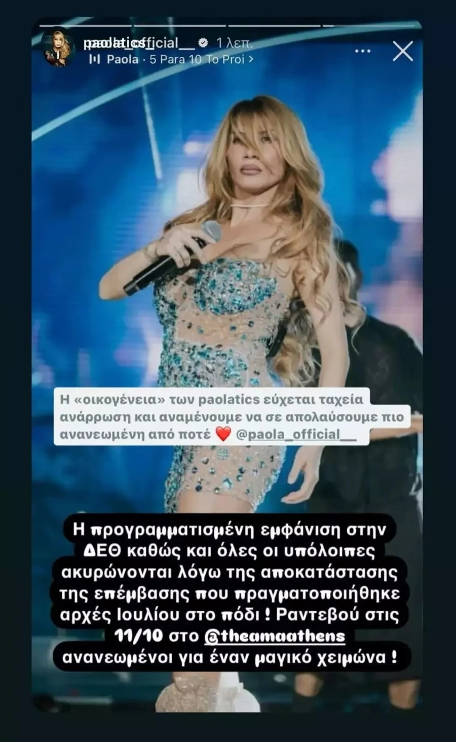 Συγκεκριμένα, όταν η Πάολα δέχθηκε την πρόταση για συναυλία στη ΔΕΘ 2024, είχε κάνει ήδη την επέμβαση στο πόδι, με την ίδια και τους συνεργάτες της να είναι αισιόδοξοι για την πορεία της ανάρρωσης. Δυστυχώς, όμως, προκειμένου η Πάολα να είναι σε θέση να ανταπεξέλθει στις απαιτήσεις μίας συναυλίας, αποφασίστηκε η ακύρωση της εμφάνισής της στη ΔΕΘ 2024.
