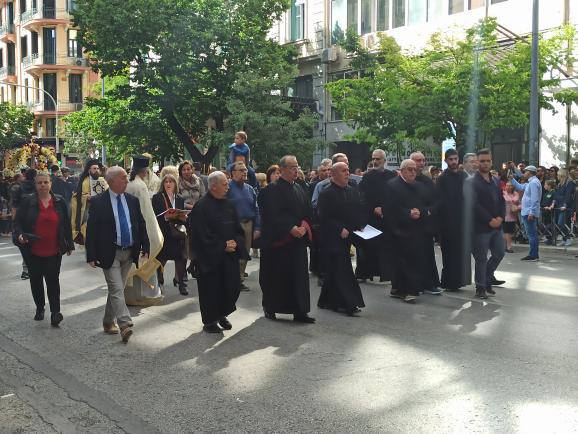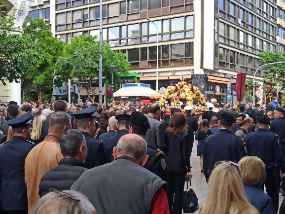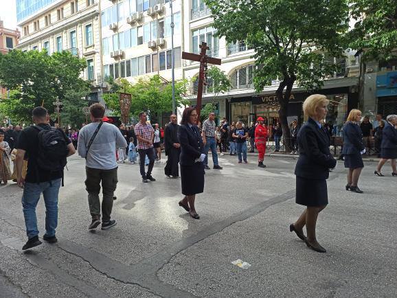 Την περιφορά του Επιταφίου, παρουσία του μητροπολίτη Θεσσαλονίκης Φιλόθεου, ακολουθούν στελέχη της τοπικής αυτοδιοίκησης και βουλευτές της πόλης.