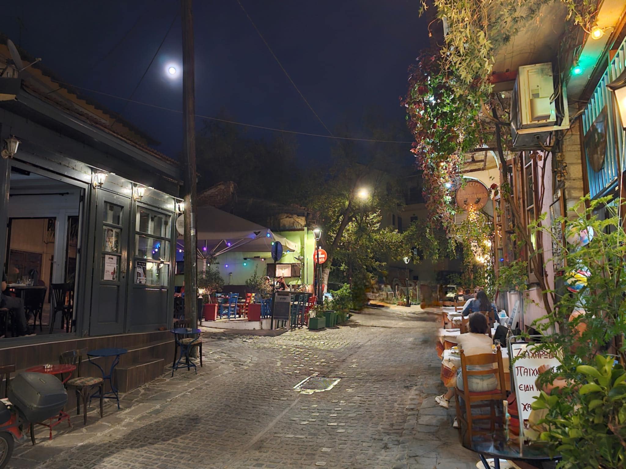 Πόσο ειδυλλιακό λοιπόν να δειπνείς με ένα ποτήρι κρασί στα τραπεζάκια πάνω στο λιθόστρωτο υπό το φως της πανσελήνου του Οκτώβρη.