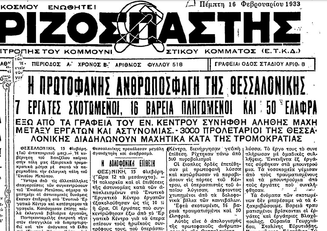 Ήταν στις 15 Φεβρουαρίου 1933, όταν στα γραφεία του υπό αριστερή διοίκηση Ενωτικού Εργατικού Κέντρου Θεσσαλονίκης (ΕΕΚΘ) που βρισκόταν στον 2ο όροφο του μεγάρου Σαλτιέλ, στη γωνία των οδών Ιουστινιανού και Βενιζέλου, απέναντι από το Καραβάν Σεράι, επρόκειτο να πραγματοποιηθεί εργατική προεκλογική συγκέντρωση του Ενιαίου Μετώπου Εργατών και Αγροτών, του μετωπικού σχήματος με το οποίο το ΚΚΕ έπαιρνε μέρος στις βουλευτικές εκλογές της 5ης Μαρτίου 1933.