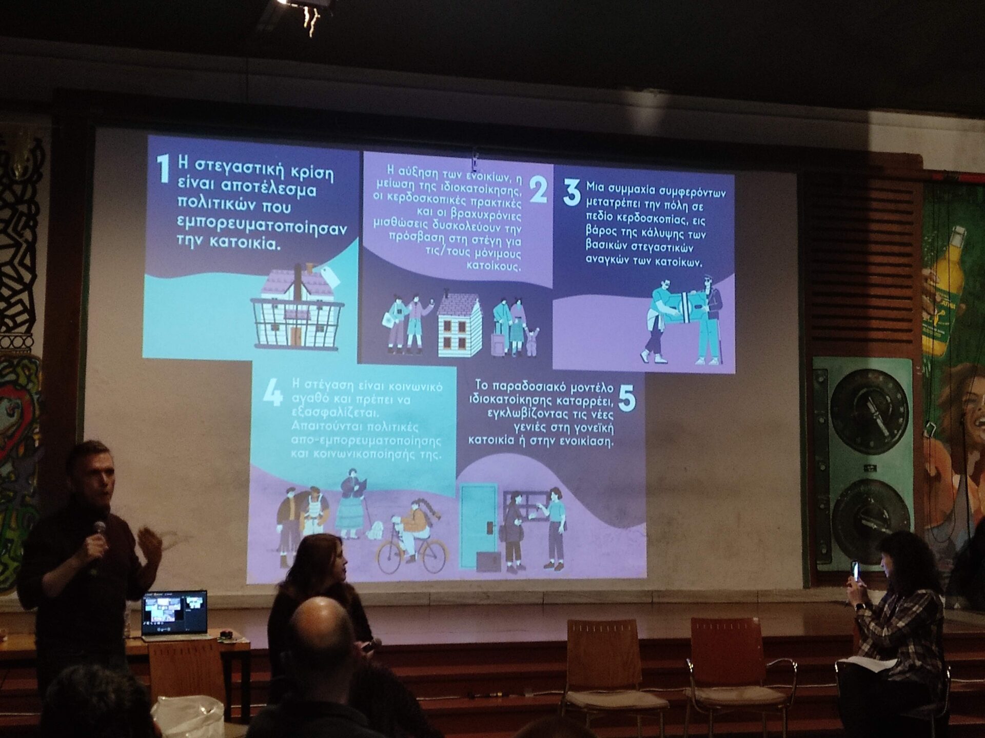 Κατά τη διάρκεια της συνάντησης ο Θοδωρής Καρυώτης, μέλος της Ένωσης, μίλησε για τις απαρχές της πρωτοβουλίας και έκανε μία προσπάθεια να συνοψίσει τα αίτια της στεγαστικής κρίσης, με βάση τις καταγραφές και τις μελέτες τους. Έκαναν λόγο για ένα φαινόμενο που ξεκίνησε από το 2011 αλλά εντάθηκε από το 2015 και εξής, με τις προσπάθειες αναθέρμανσης της κτηματαγοράς, κάνοντας την κατοικία εμπορικό και επενδυτικό προϊόν. Στην πορεία, η έκρηξη των βραχυχρόνιων μισθώσεων και οι καταχρηστικές πρακτικές ενέτειναν την προβληματική κατάσταση, η οποία μία «συμμαχία συμφερόντων» από επενδυτές, κατασκευαστές, ιδιοκτήτες κτλ., σύμφωνα με τον κ. Καρυώτη, θέλουν να διατηρηθεί.