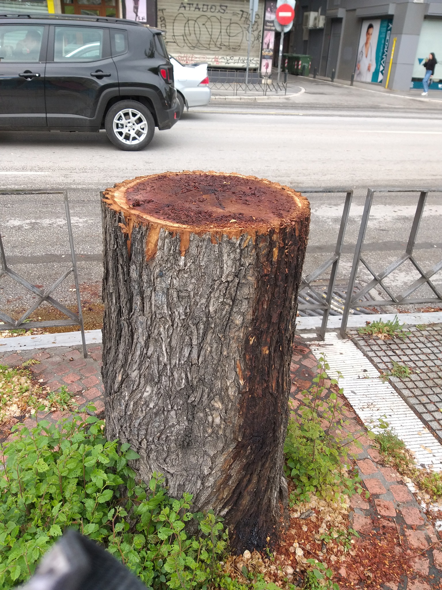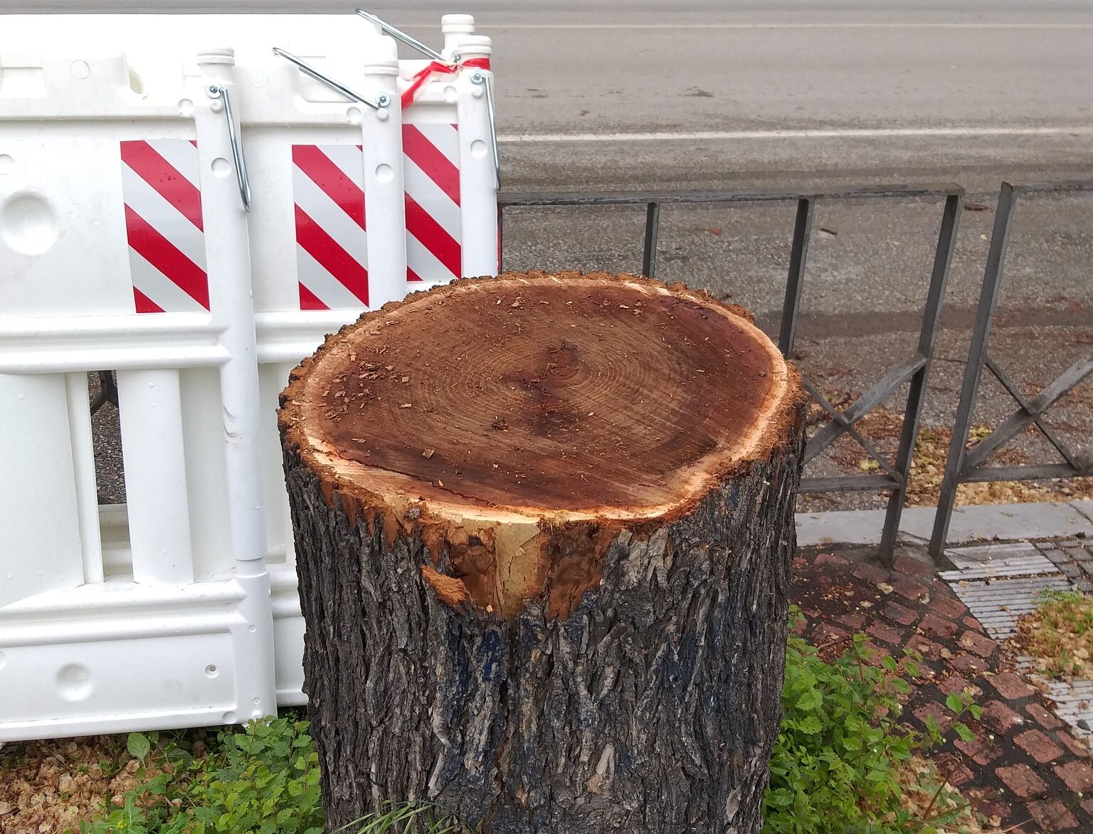 Κόπηκαν 8 δέντρα, όλα φτελιές. Φυτεύτηκαν 2 νέα δέντρα, μελικουκιές, χωρίς να είμαι σε θέση να γνωρίζω αν έγινε αντικατάσταση ή δεν υπήρχε τίποτα σ’ αυτές τις θέσεις. Δύο από παλιότερα κομμένα δέντρα, παραμένουν προς το παρόν ως έχουν. Τα δέντρα που κόπηκαν δεν ήταν σάπια, όπως φαίνεται και στις φωτογραφίες.