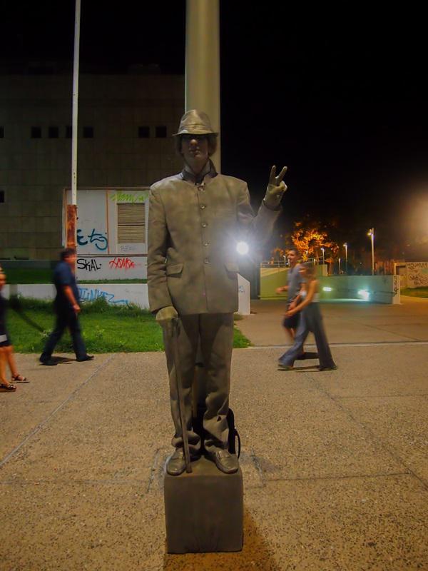 Ακριβώς απέναντι, είναι ο Ηλίας ο Grey. Μην πάει ο νους σας στο κακό. Street performer, ή όπως θέλουμε στα ελληνικά να τον παρουσιάζουμε, Μίμος. Ντυμένος στα γκρι, πάνω σε ένα σκαμνάκι με μια μαγκούρα στο χέρι μας χαιρετά ευγενικά. Η φωνή του ακούγεται μόνο όταν προφέρει το όνομά του. Μετά τον κύκλωσαν παιδάκια κι έπρεπε να συνεχίσει το σόου του.