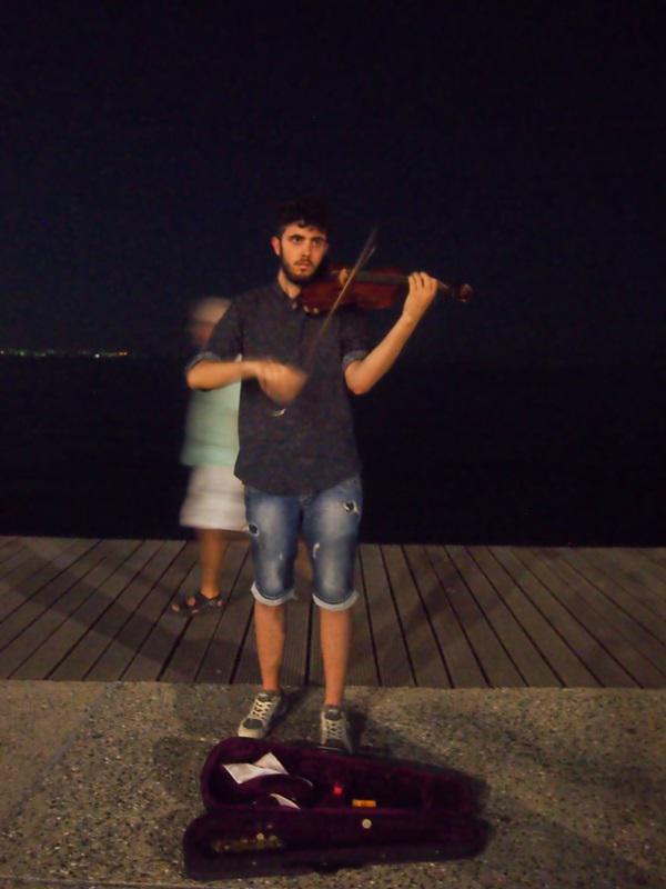 Σε μια από τις ξύλινες προβλήτες στέκεται ο Θοδωρής. Με ένα βιολί κι ένα δοξάρι, ξυπνά τον ρομαντικό μέσα μας. “Κλαίνε” οι χορδές και τον πλησιάζω για να μάθω μερικά πράγματα γι΄αυτόν. Παίζοντας τα τελευταία έξι χρόνια βιολί, αποφάσισε να εκθέσει το ταλέντο του στο δρόμο. Είναι ο νεότερος μουσικός στην περιοχή για δύο λόγους. Αρχικά, γιατί διανύει το εικοστό έτος της ζωής του και έπειτα γιατί στην παραλία μετρά μόλις μια βδομάδα κλασικής μουσικής για ένα βιολί.