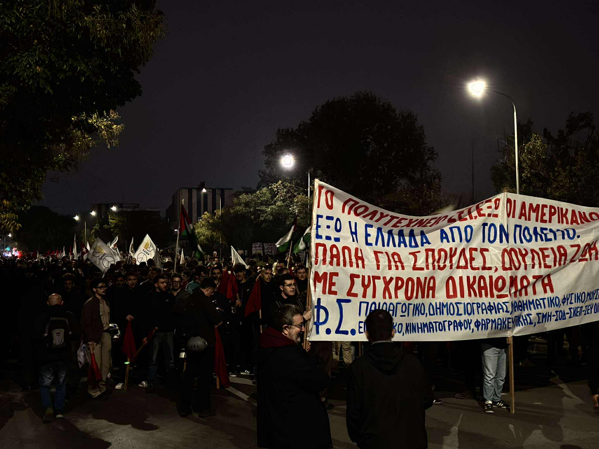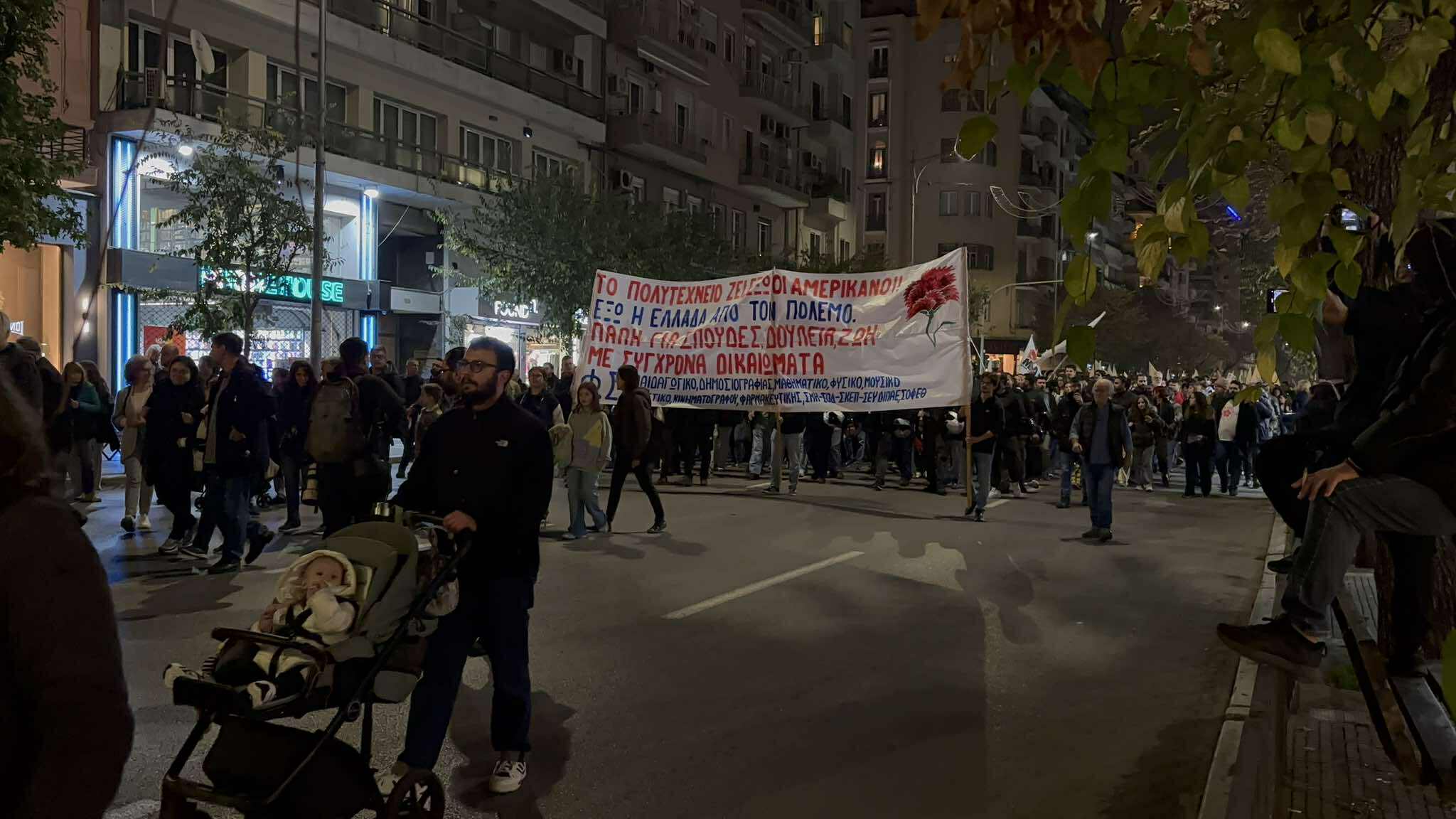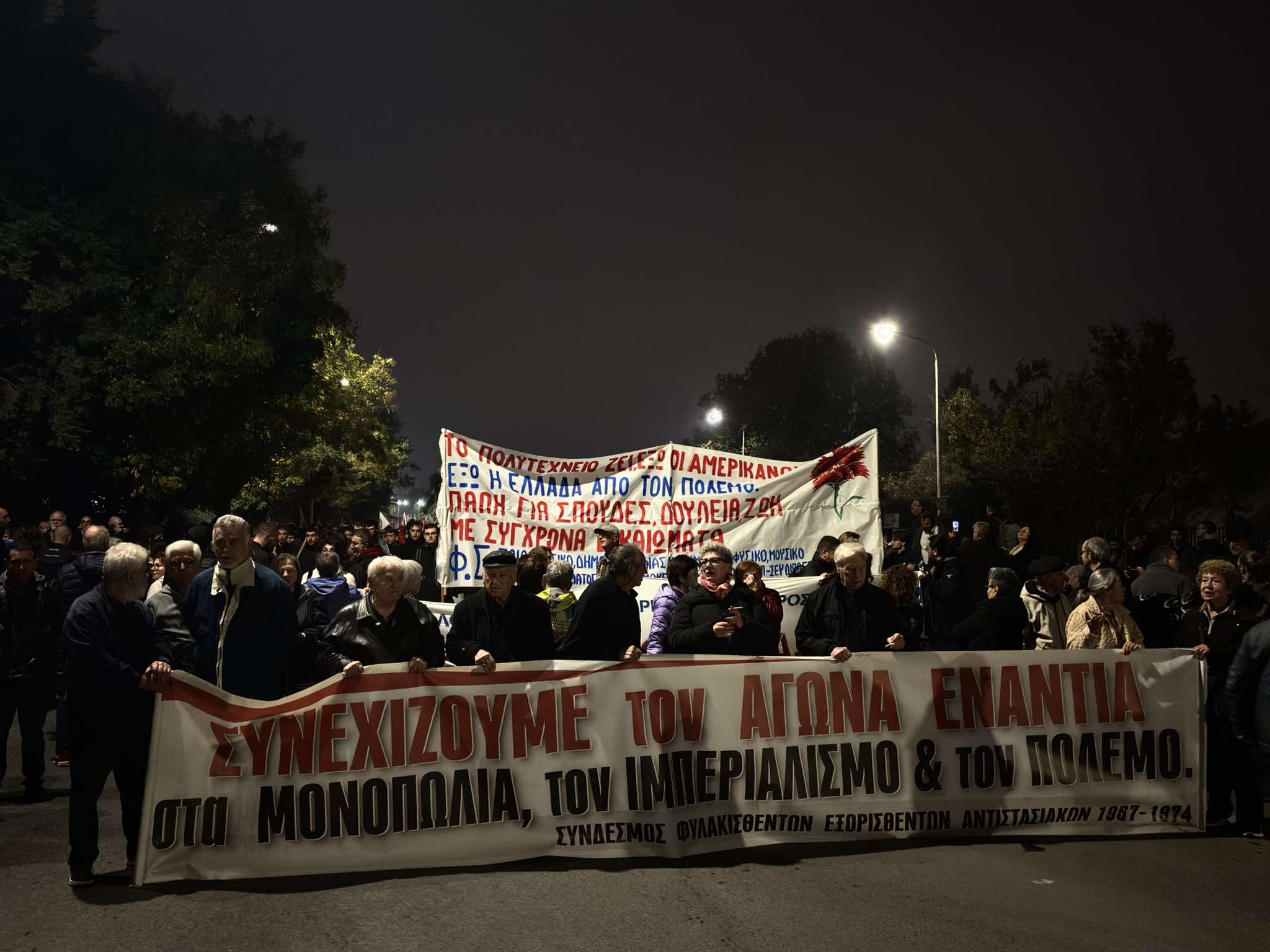 Για άλλη μια χρονιά, στην κεφαλή της πορείας βρίσκονται τα μέλη του Συλλόγου Φυλακισθέντων και Εξορισθέντων Αντιστασιακών, που υπέφεραν κατά τη διάρκεια της χούντας των συνταγματαρχών. Χιλιάδες πολίτες συμμετέχουν στη μαζική κινητοποίηση, κατευθυνόμενοι μέσω της οδού Εθνικής Αμύνης προς την Τσιμισκή. Πολλές είναι επίσης οι σημαίες της Παλαιστίνης και τα μηνύματα αλληλεγγύης στον παλαιστινιακό λαό, ενώ δεν λείπουν και αναφορές στην τραγωδία των Τεμπών.