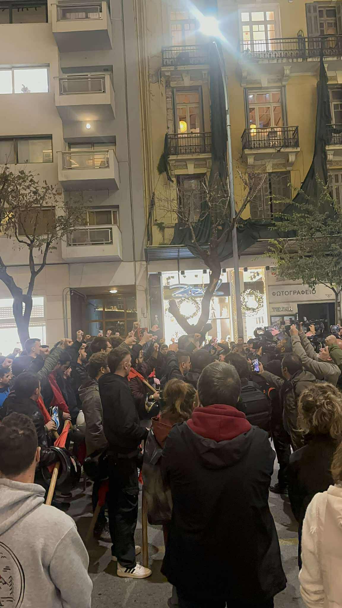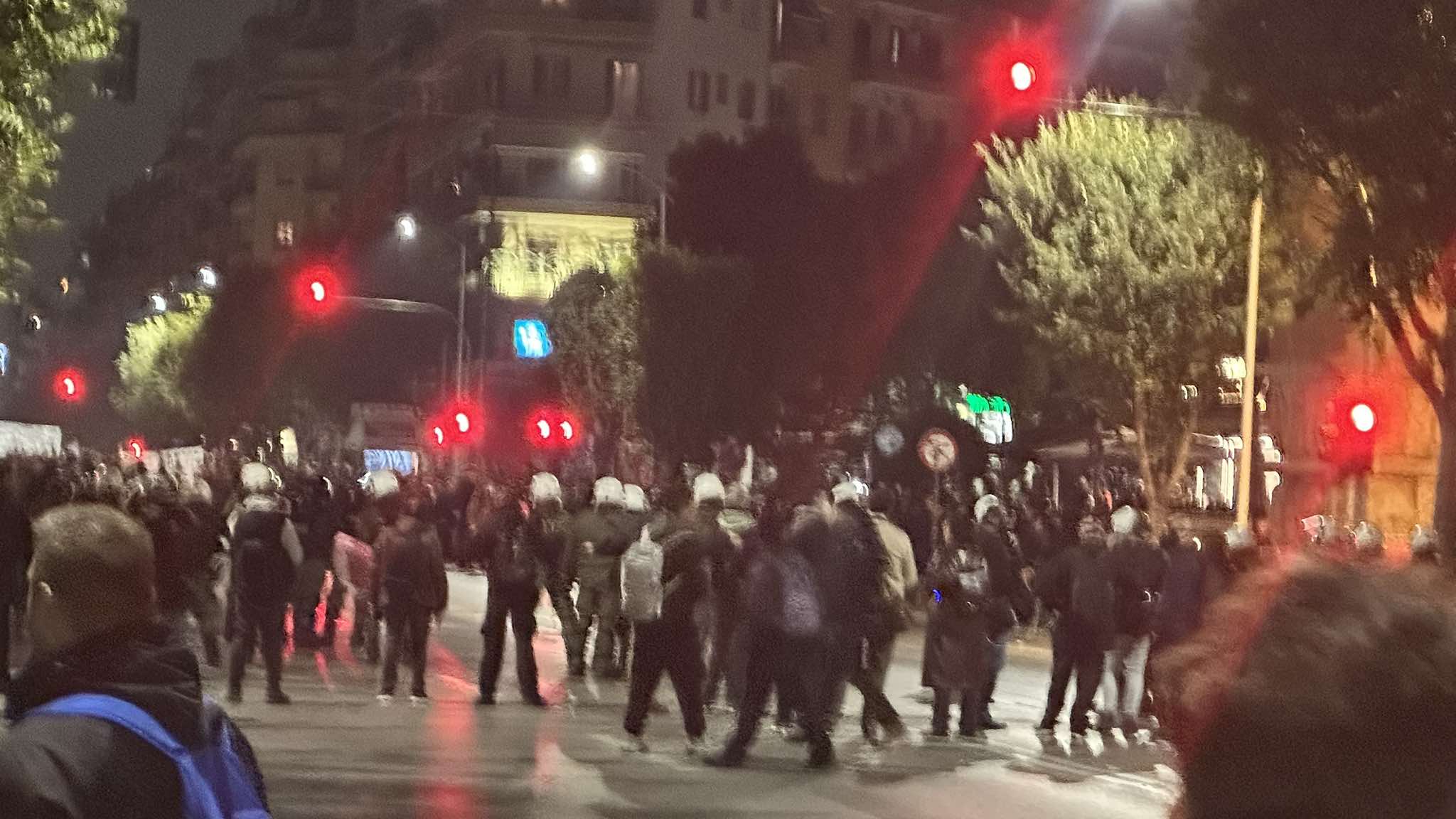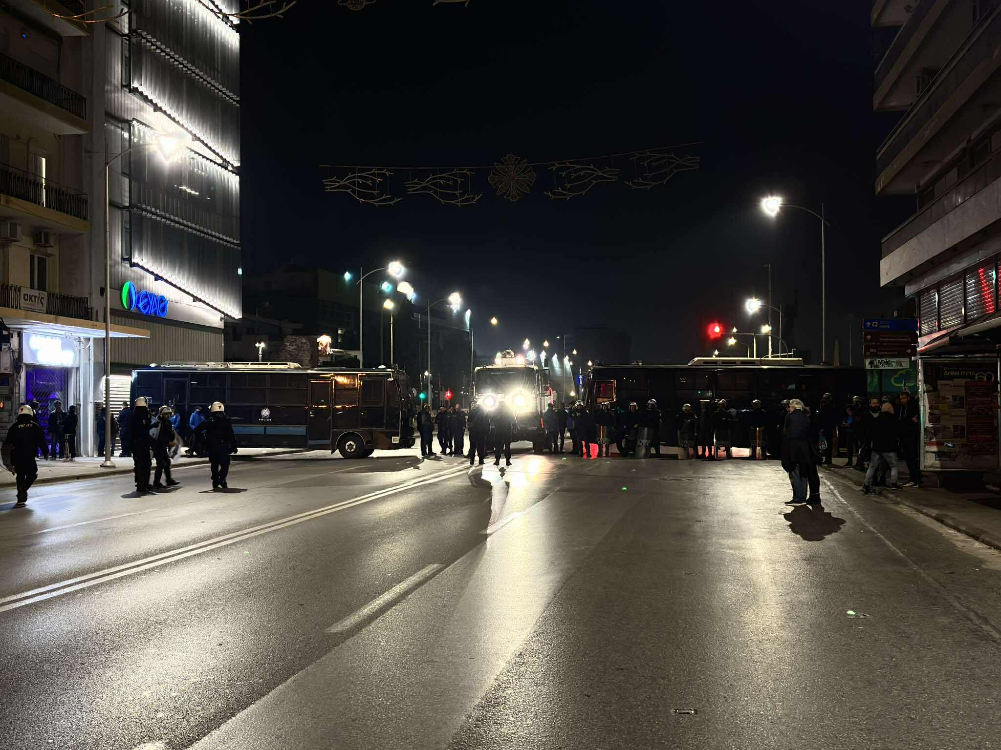 Αυτή τη στιγμή η πορεία πλησιάζει στην Καμάρα, στο ύψος της οποίας η Εγνατία είναι κλειστή από δεκάδες κλούβες των ΜΑΤ καθώς επίσης και με το όχημα εκτόξευσης νερού “Αύρα”. Νωρίτερα ολοκληρώθηκε και η φοιτητική κινητοποίηση.