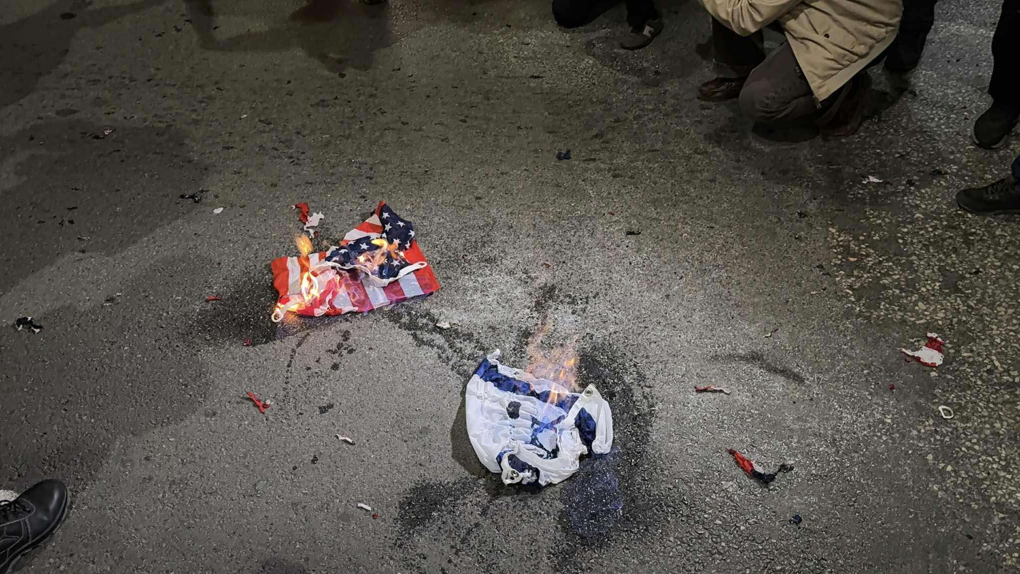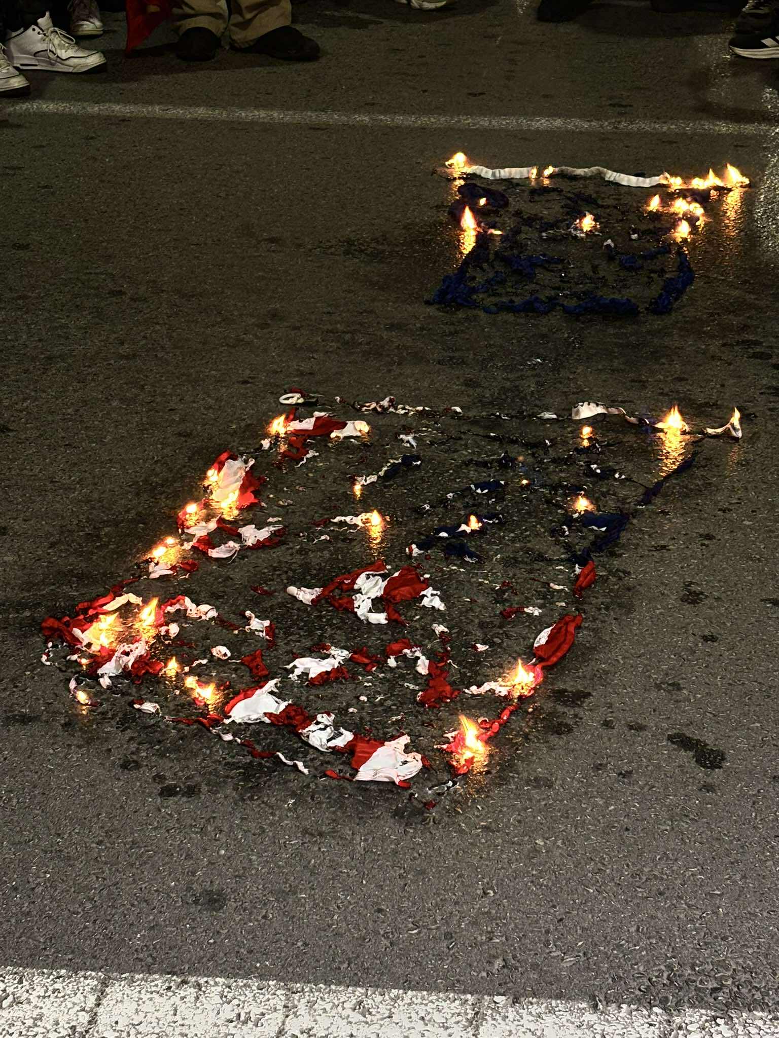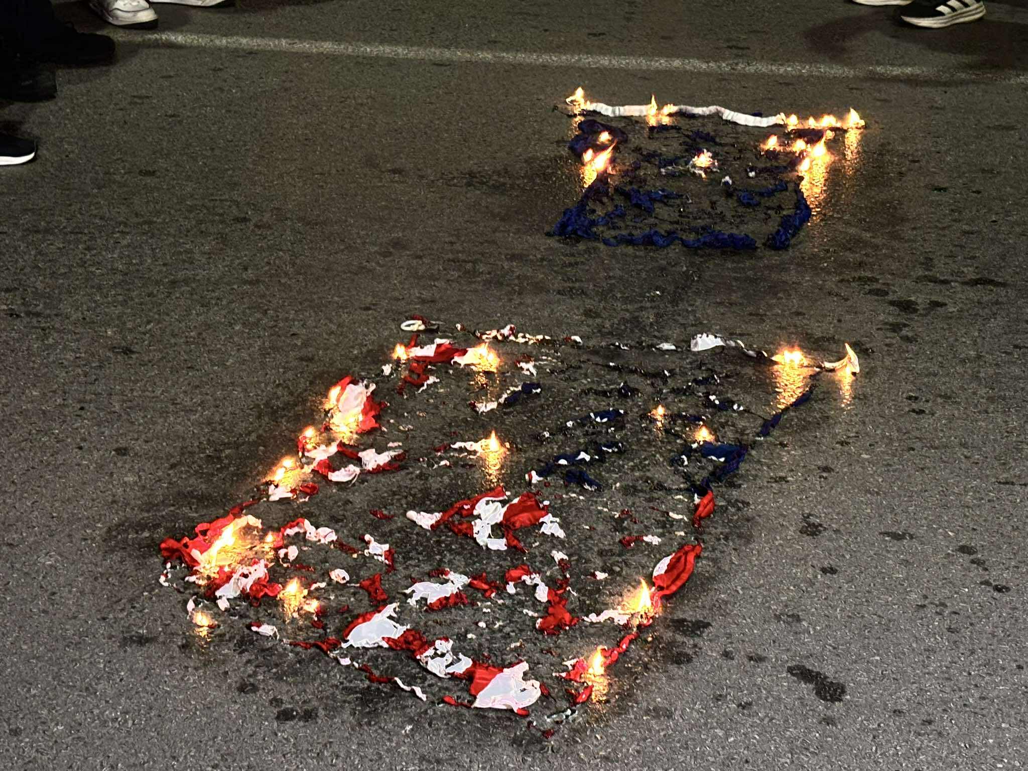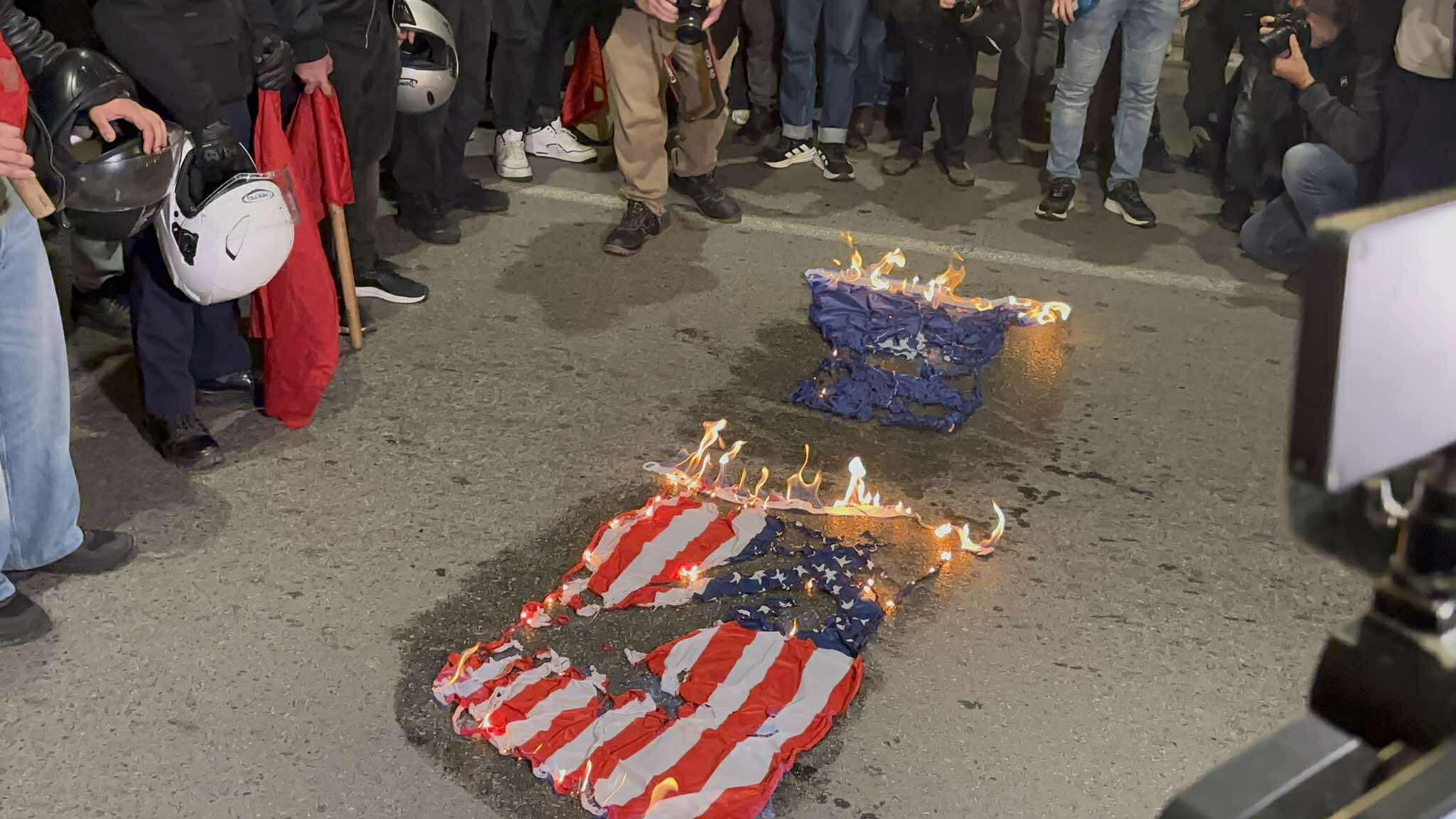 Λίγο αργότερα διαδηλωτές έκαψαν σημαίες των ΗΠΑ και του ΝΑΤΟ μπροστά από το Προξενείο, ενώ άλλοι που ακολούθησαν από πίσω εκτός από την αμερικανική σημαία έκαψαν και αυτή του Ισραήλ.