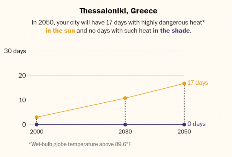 Μπορεί με την πάροδο του χρόνου, οι περιοχές και οι πολιτισμοί να έχουν προσαρμοστεί σε πολύ ζεστές συνθήκες, ωστόσο, σύμφωνα με νέα ανάλυση δεδομένων, κάποια μέρη του κόσμου – ανάμεσά τους και ελληνικές πόλεις- θα αντιμετωπίσουν απότομες αυξήσεις στις θερμοκρασίες, απειλώντας την ικανότητα των ανθρώπων να αντέξουν ακόμα και σε ζεστά μέρη.