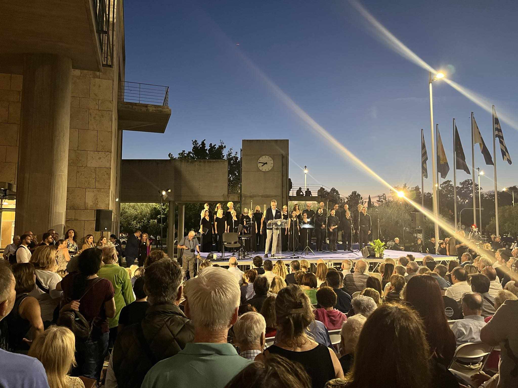 Ο Διονύσης Σαββόπουλος, αφού ολοκλήρωσε την ομιλία του, τραγούδησε μερικά από τα αγαπημένα τραγούδια του, με τη Μικτή Χορωδία Θεσσαλονίκης.