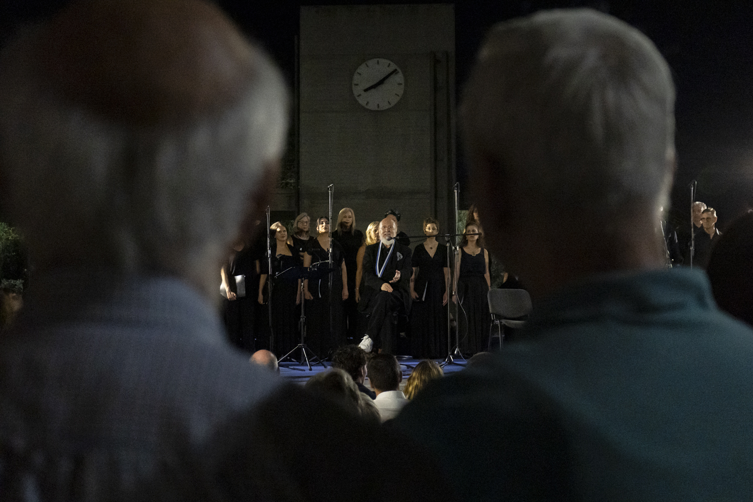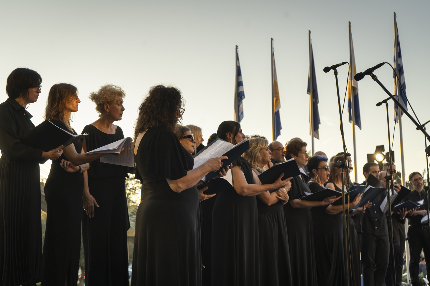 Ο Διονύσης Σαββόπουλος, αφού ολοκλήρωσε την ομιλία του, τραγούδησε μερικά από τα αγαπημένα τραγούδια του, με τη Μικτή Χορωδία Θεσσαλονίκης.