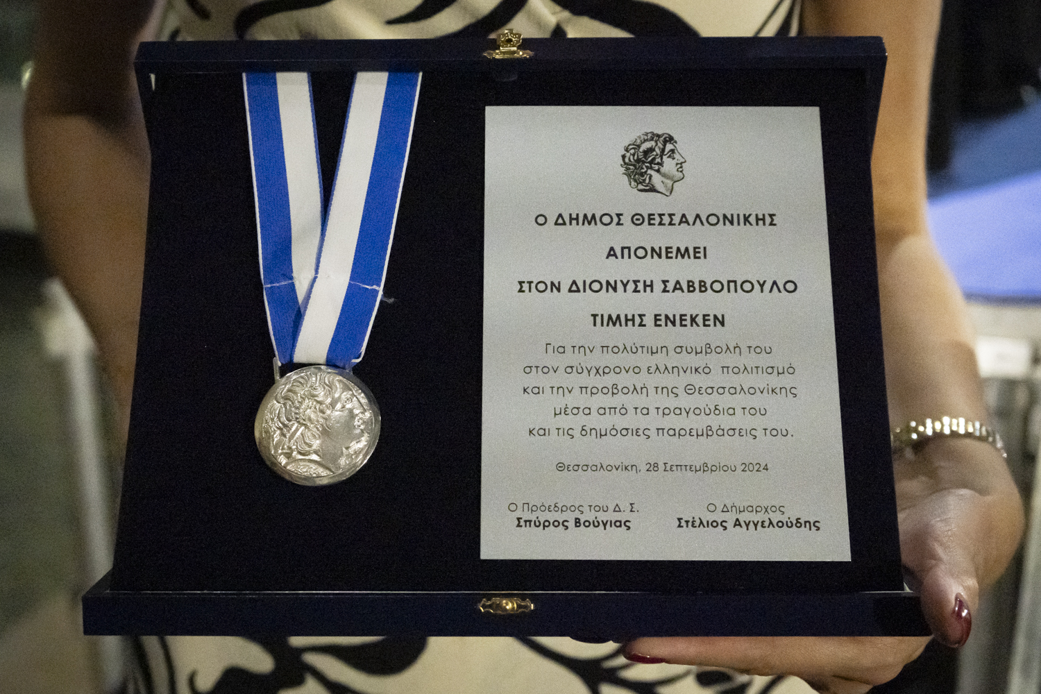 Πλήθος πολιτών συγκεντρώθηκε το απόγευμα του Σαββάτου 28 Σεπτεμβρίου, στον αύλειο χώρο του Δημαρχείου Θεσσαλονίκης, όπου απονεμήθηκε στο Διονύση Σαββόπουλο το Αργυρό Μετάλλιο της πόλης.