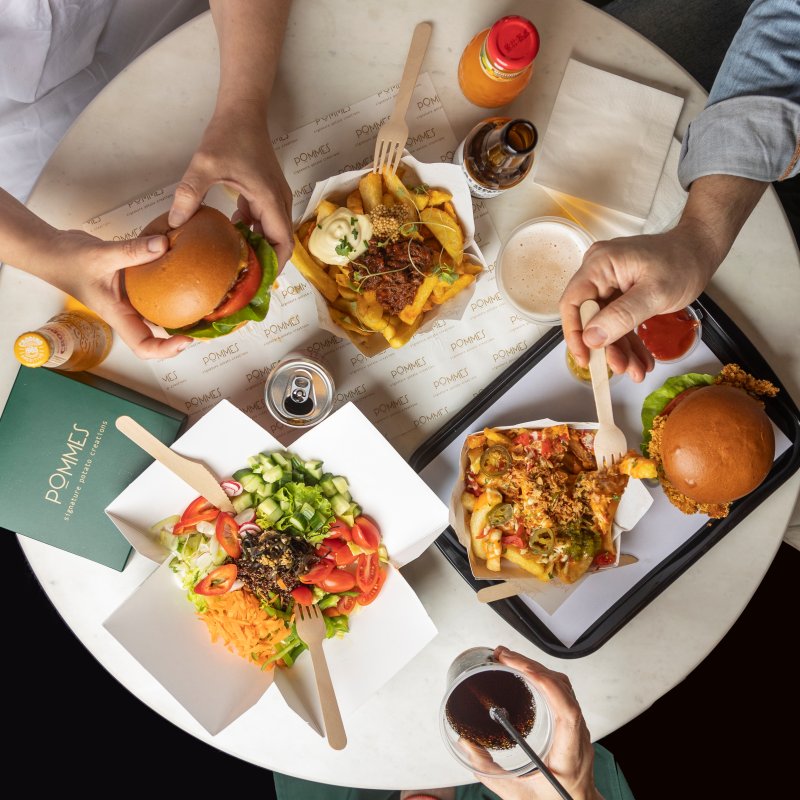 Οι γρήγοροι ρυθμοί της νεολαίας απαιτούν εύκολες και γρήγορες λύσεις διατροφής στην καθημερινότητά τους, που δεν κάνουν, όμως, καμία υποχώρηση στην ποιότητα και τη γεύση. Γι’ αυτό και το Pommes διάλεξε την ιδανικότερη θέση στο κέντρο της Θεσσαλονίκης -εκεί όπου χτυπάει ο παλμός της νεανικής διασκέδασης- για να προσφέρει τον απόλυτο γευστικό συνδυασμό που όλοι λατρεύουμε: ζουμερά, πεντανόστιμα burgers και φρεσκοκομμένες, τραγανές, τηγανητές πατάτες -νοστιμότερες δε δοκίμασες ποτέ.