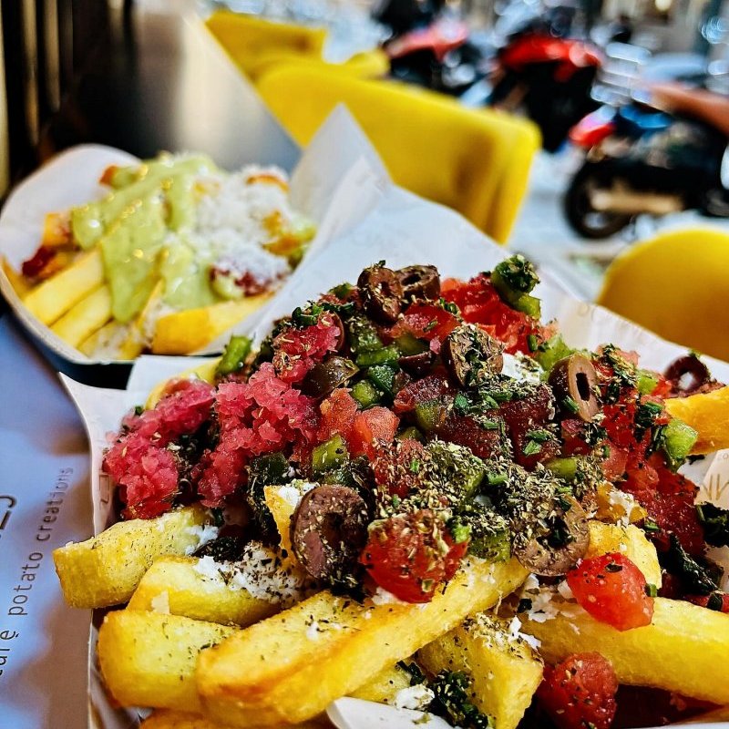 Πριν δεις τον κατάλογο, επίλεξε το συγκλονιστικό μπαλκονάκι, με θέα το Ρωμαϊκό Ανάκτορο του Γαλέριου, στο cosy αυτό hot spot, με τη φίνα αισθητική. Η ιδέα είναι τέλεια: πιάτα που έχουν βάση άριστης ποιότητας χρυσοκίτρινες πατάτες, με γεύσεις μελετημένες κι εκτελεσμένες στην εντέλεια. Η ποικιλία είναι μεγάλη, αλλά θα πάρεις μια ιδέα από τις πατατοκροκέτες, το αφράτο potato bun, το Fancy porky με pulled pork, το Med Flavors με μαγιονέζα βασιλικού, ντοματίνια κονφί και παρμεζάνα ή τη Spicy lips με cheddar, χαλαπένιος και τηγανητά κρεμμύδια. Τα special burgers γίνονται με ψωμάκι πατάτας και mix υλικών σε παραλλαγές γεύσεων, στα οποία σίγουρα θα εθιστείς.