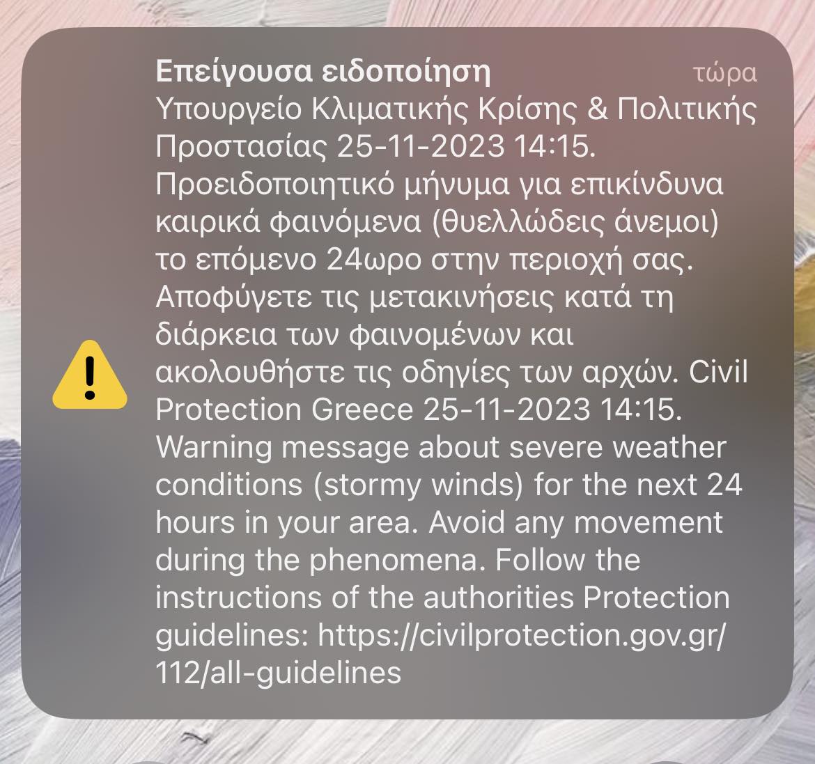 Υπουργείο Κλιματικής Κρίσης & Πολιτικής Προστασίας 25-11-2023 14:15. Προειδοποιητικό μήνυμα για επικίνδυνα καιρικά φαινόμενα (θυελλώδεις άνεμοι) το επόμενο 24ωρο στην περιοχή σας. Αποφύγετε τις μετακινήσεις κατά τη διάρκεια των φαινομένων και ακολουθήστε τις οδηγίες των αρχών. Civil Protection Greece 25-11-2023 14:15. Warning message about severe weather conditions (stormy winds) for the next 24 hours in your area. Avoid any movement during the phenomena. Follow the instructions of the authorities Protection guidelines: https://civilprotection.gov.gr/112/all-guidelines
