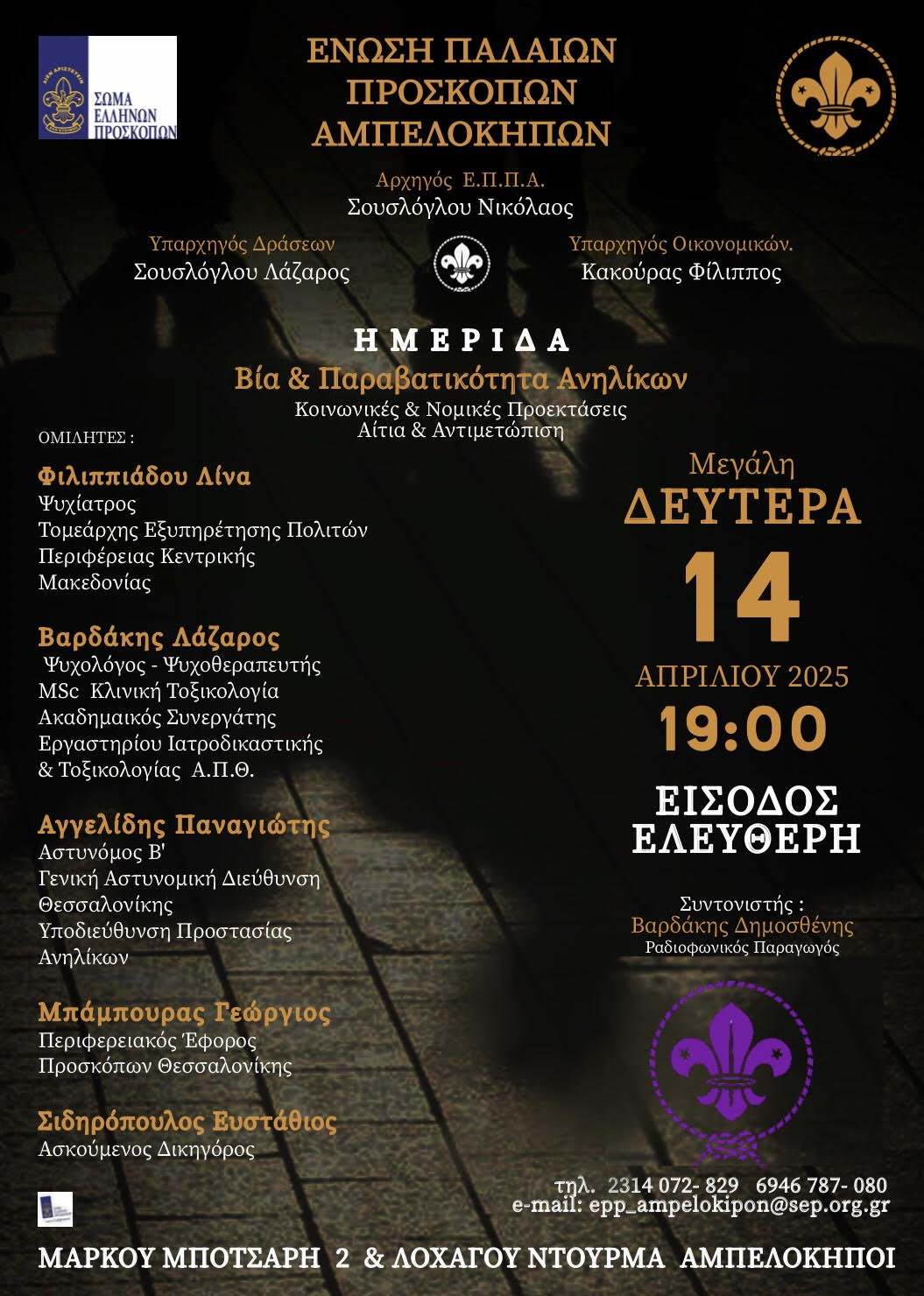 Η Ένωση Παλαιών Προσκόπων Αμπελοκήπων την ΜΕΓΑΛΗ ΔΕΥΤΕΡΑ 14/4/2025 και ώρα 7:00΄ μ.μ. , διοργανώνει στην έδρα της επί της οδού Λοχαγού Ντούρμα και Μάρκου Μπότσαρη αρ. 2, Αμπελόκηποι Θεσσαλονίκη , ΗΜΕΡΙΔΑ με θέμα: ΒΙΑ ΚΑΙ ΠΑΡΑΒΑΤΙΚΟΤΗΤΑ ΑΝΗΛΙΚΩΝ (Αίτια και αντιμετώπιση)