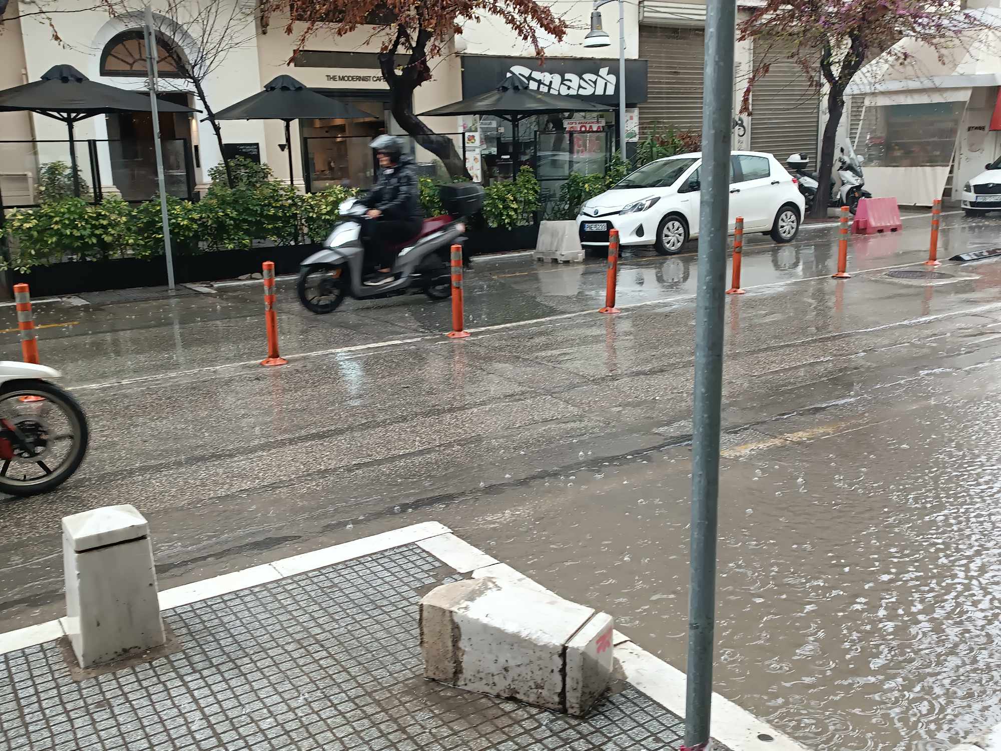 Ταυτόχρονα, κυκλοφοριακό χάος προκαλείται στους δρόμους της πόλης από την έντονη κίνηση των αυτοκινήτων, λόγω της νεροποντής.