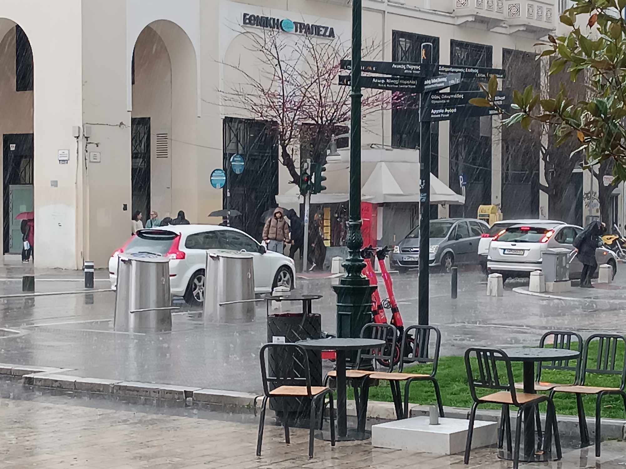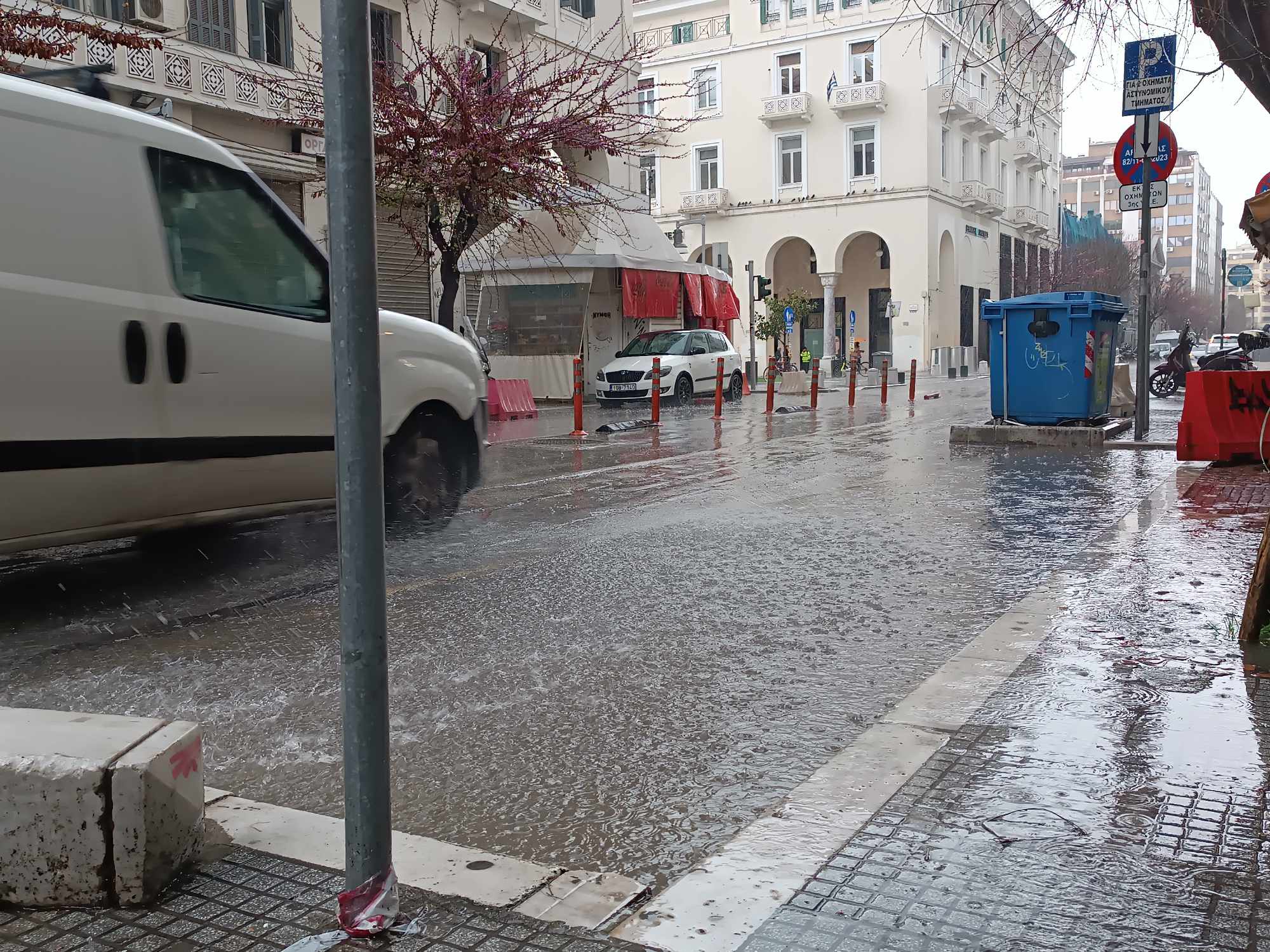 Δυνατή βροχή έπληξε τη Θεσσαλονίκη το μεσημέρι της Τρίτης, με τους δρόμους να γίνονται “ποτάμια” στο κέντρο της πόλης.