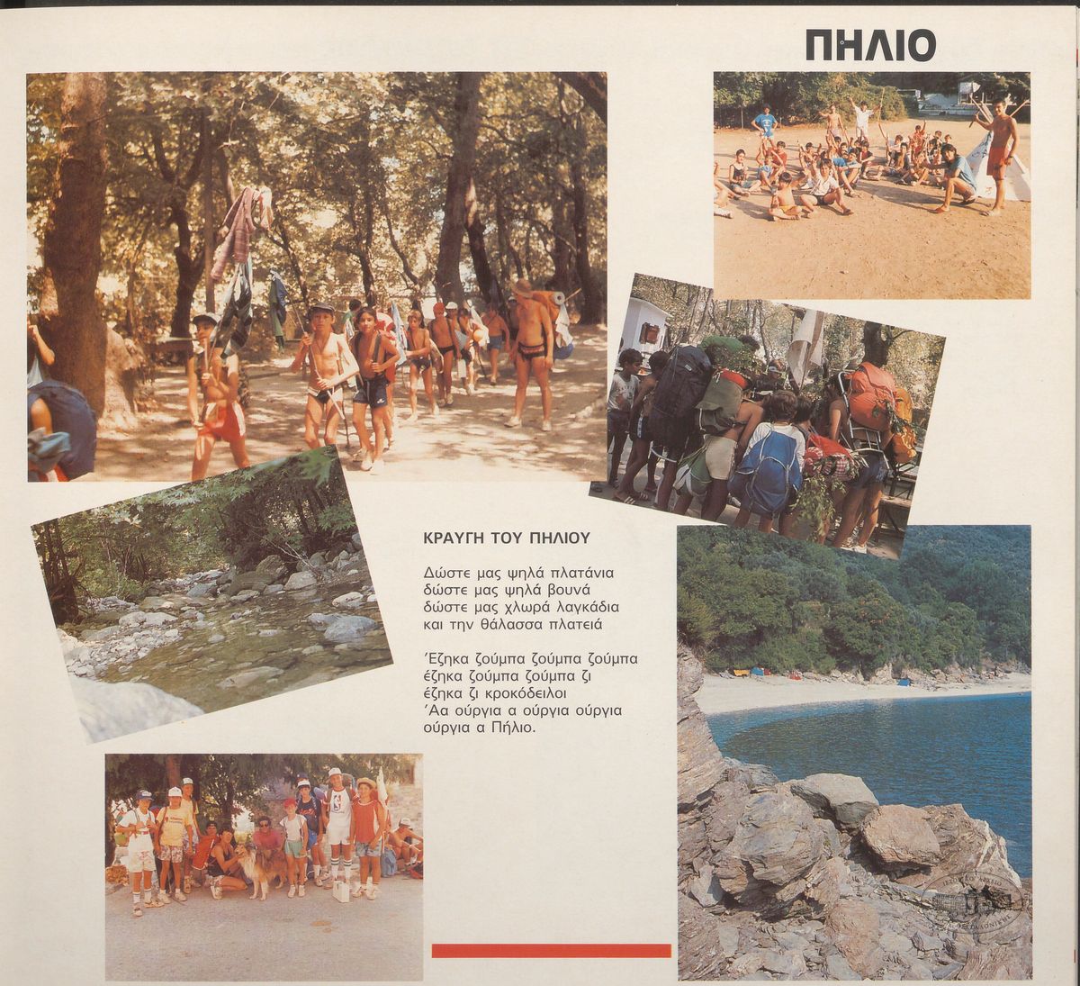 «Το γενικό πρόγραμμα μιας περιόδου προβλέπει 3 πορείες: την πορεία για διανυκτέρευση στην παραλία Άγιοι Σαράντα, μια μονοήμερη διανυκτέρευση στα χωριά Άγιο Δημήτριο, Μούρεσι, Κισσό, Τσαγκαράδα (ανάλογα με την ηλικία), τα Σαφάρια, την “Περιπέτεια”, το σαφάρι στη Σκιάθο. Η κορυφαία πορεία όλων είναι το παραδοσιακό μεγάλο Σαφάρι. Όταν συμμετείχαμε στην κατασκήνωση ήταν πραγματικά τιμητικό να μας επιλέξουν οι υπεύθυνοι στη θρυλική αυτή πορεία, καθώς πρόκειται για τριήμερη πορεία μιας ολιγομελούς ομάδας στο βουνό μέχρι τα Χάνια και πίσω, περίπου 80 χλμ διαδρομής. Η εμπειρία είναι μοναδική καθώς, πέρα από ιδιαίτερα απαιτητική, δίνει τη δυνατότητα να διασχίσει κανείς το μαγικό αυτό βουνό, γνωρίζοντάς το με τον πιο γνήσιο τρόπο, μέσα από το εκτενές και πυκνό δίκτυο μονοπατιών και καλντεριμιών, βαδίζοντας δίπλα στα τρεχούμενα νερά των πηγών, διανυκτερεύοντας στις πλατείες των χωριών και τους αυλόγυρους των σχολείων, ξαποσταίνοντας στα καφενεία με ένα γλυκό του κουταλιού ή την τοπική λεμονάδα, βουτώντας στις γούβες των ποταμιών με τα παγωμένα νερά, δοκιμάζοντας τις αντοχές στην απαιτητική ανηφόρα ή κακοτράχαλη απότομη κατηφόρα, ακολουθώντας το ένστικτο προκειμένου να αποφασιστεί σε ποιο μονοπάτι της διχάλας που συναντάται θα συνεχίσει η πορεία, προσπαθώντας να βρεθεί ο σωστός δρόμος προς τον προορισμό, σε περίπτωση βροχής να υπάρξει μέριμνα για την καλύτερη προστασία και ασφάλεια των παιδιών»