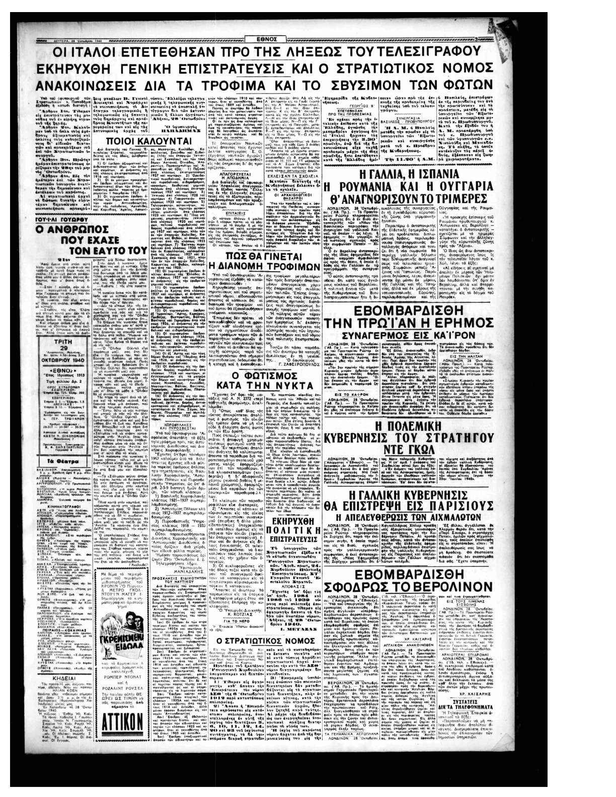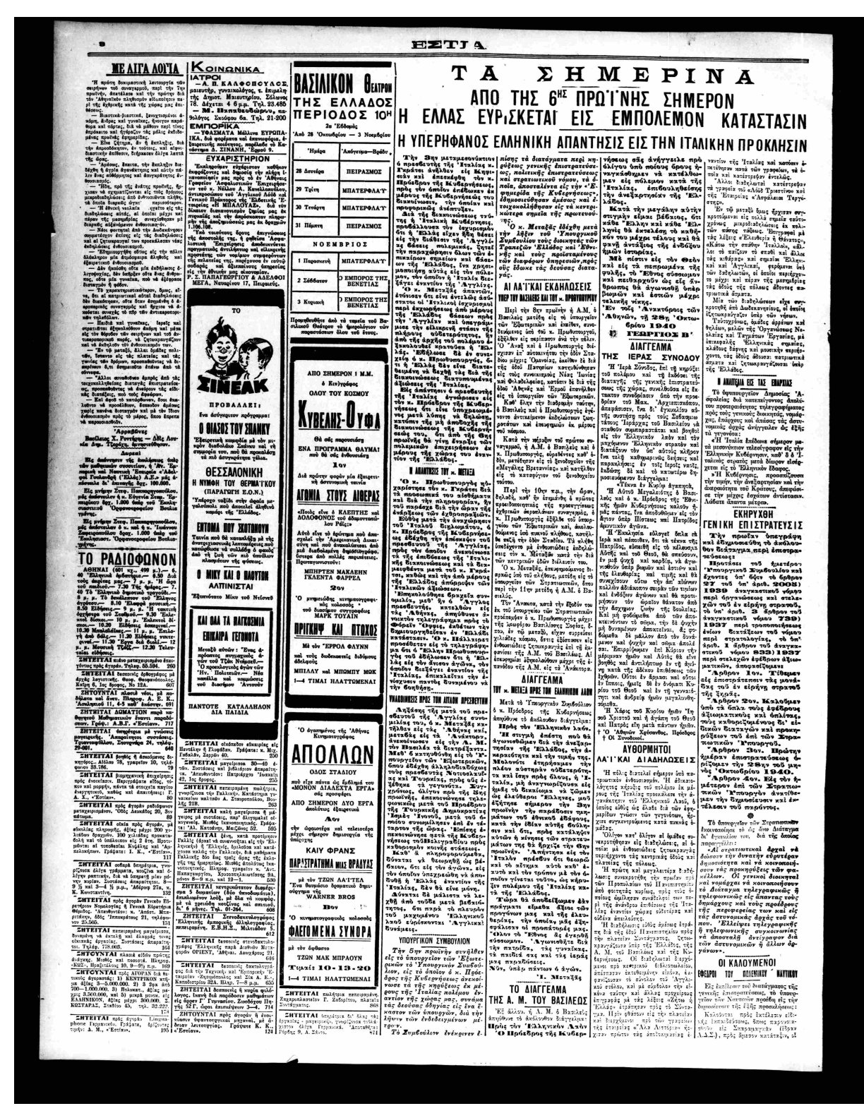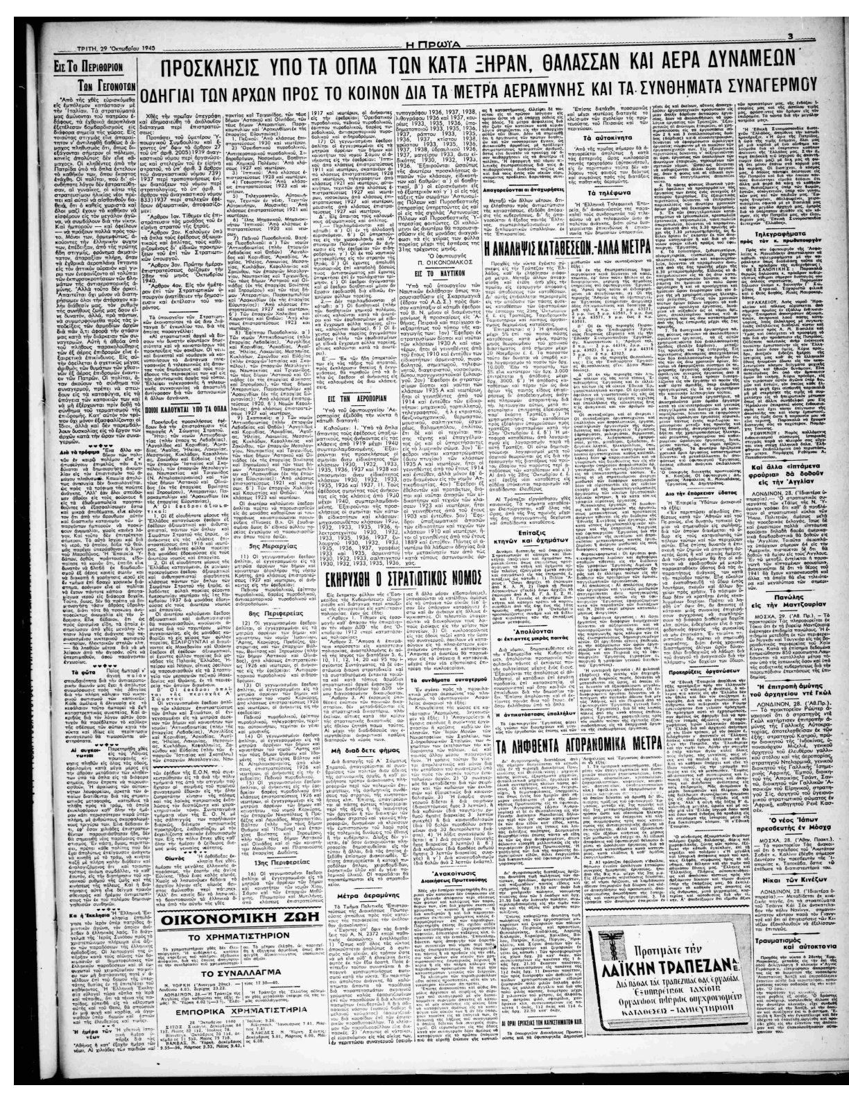 Παραμέσα, οδηγίες για συγκέντρωση υποζυγίων στο άλσος Παγκρατίου, ώστε να επιταχθούν, capital controls στις καταθέσεις (από τότε!) και απαγόρευση εξόδου από την επικράτεια. Στο πρόγραμμα του «Σινεάκ» ένα ωραίο φιλμάκι για τη Θεσσαλονίκη και καρτούν: «Ο Μίκυ και ο Πλούτων αλπινισταί, του Ντίσνεϊ»!