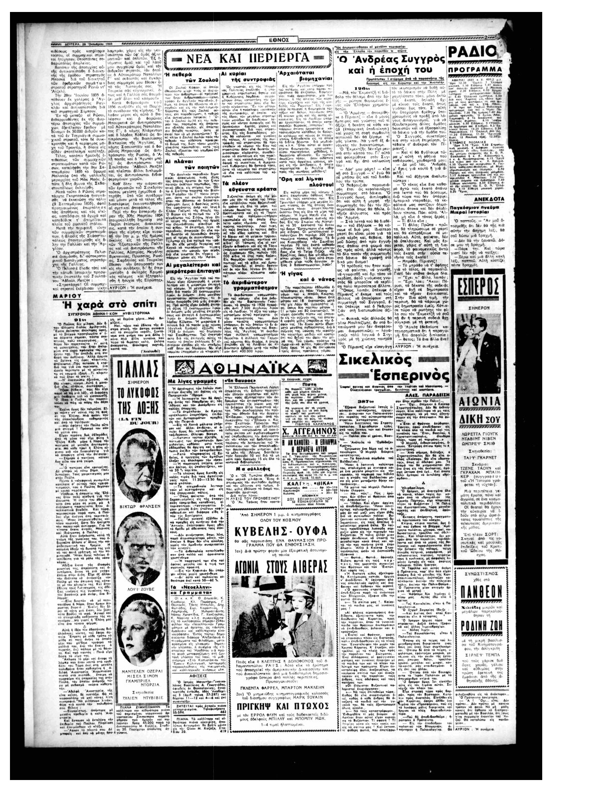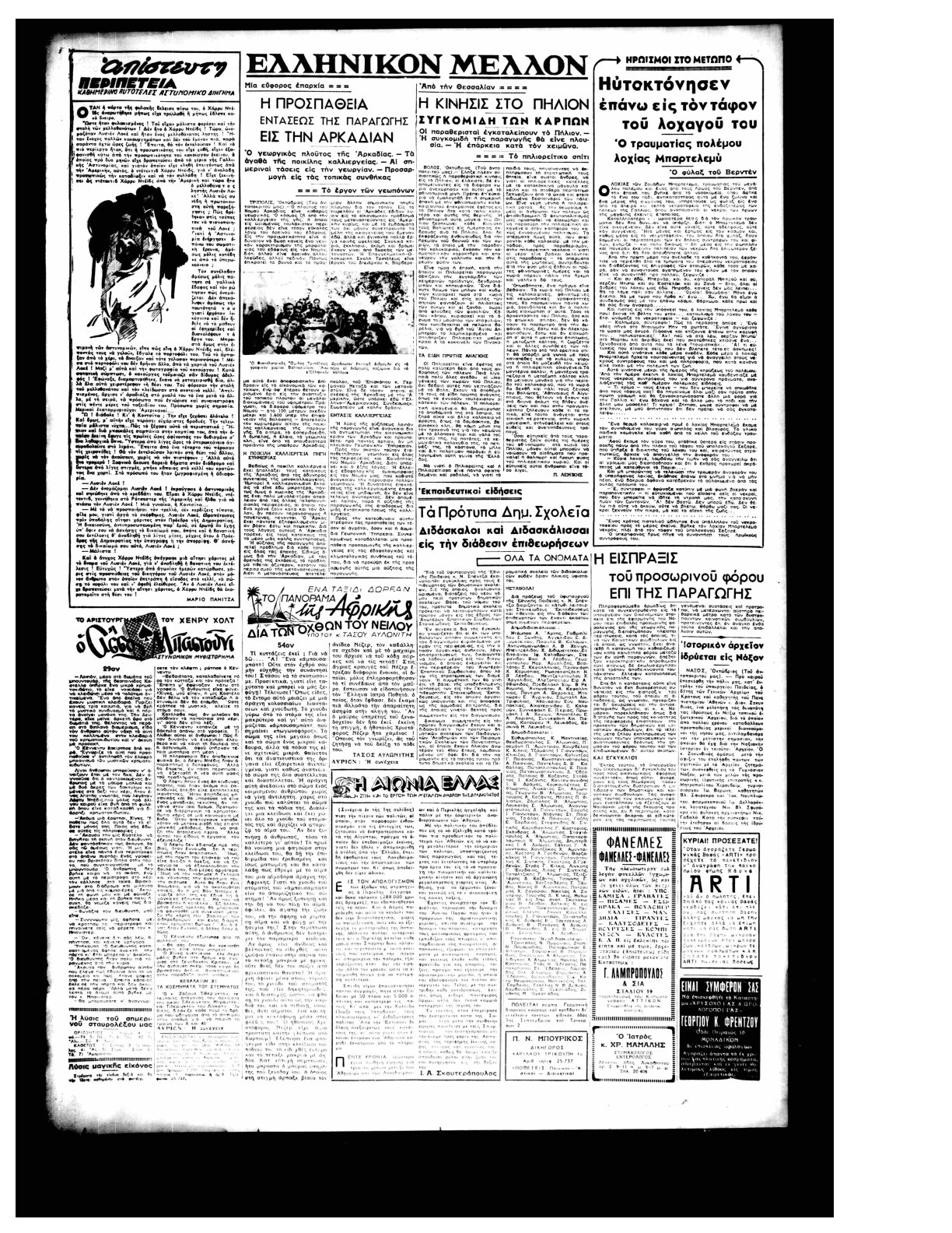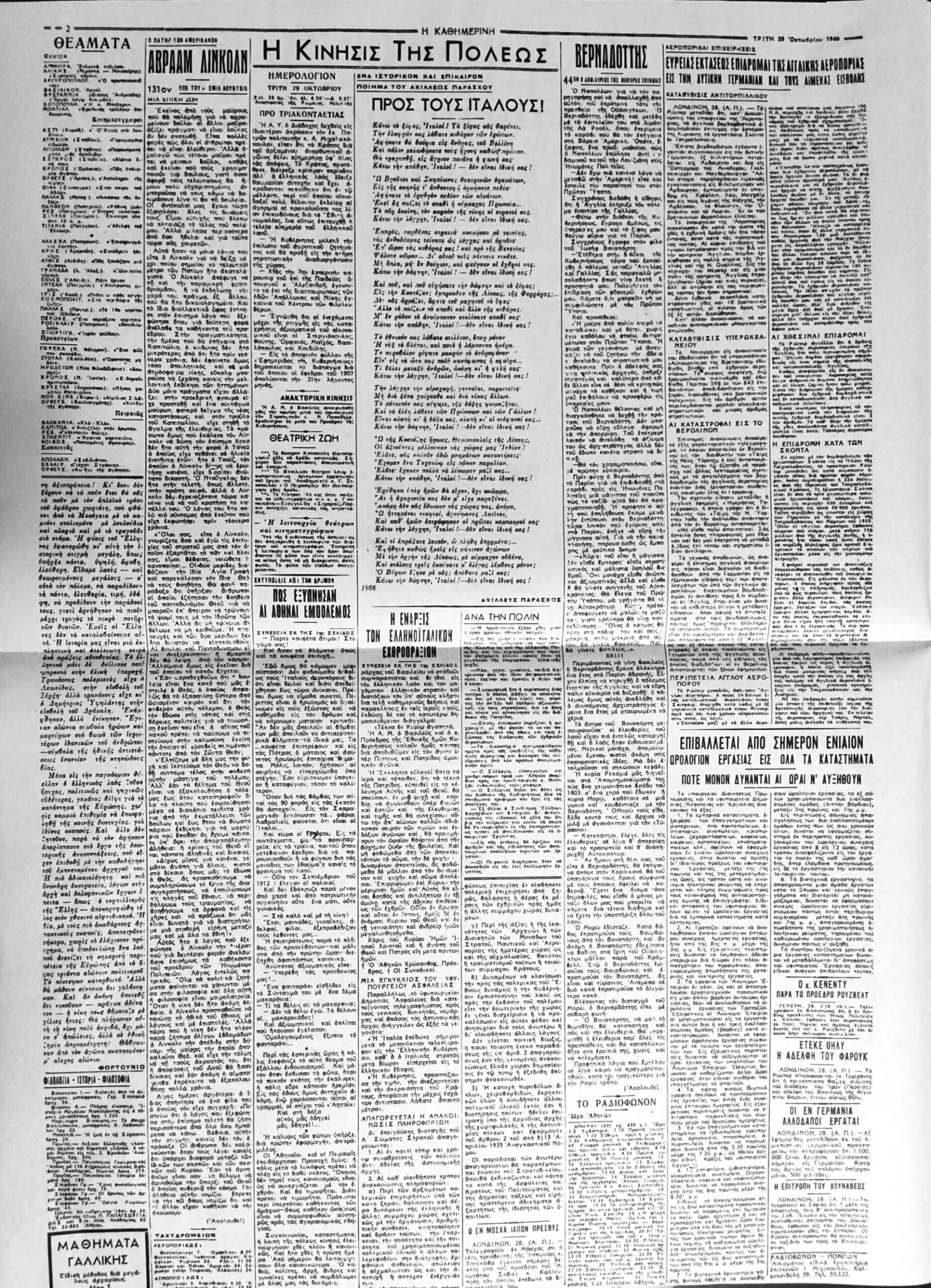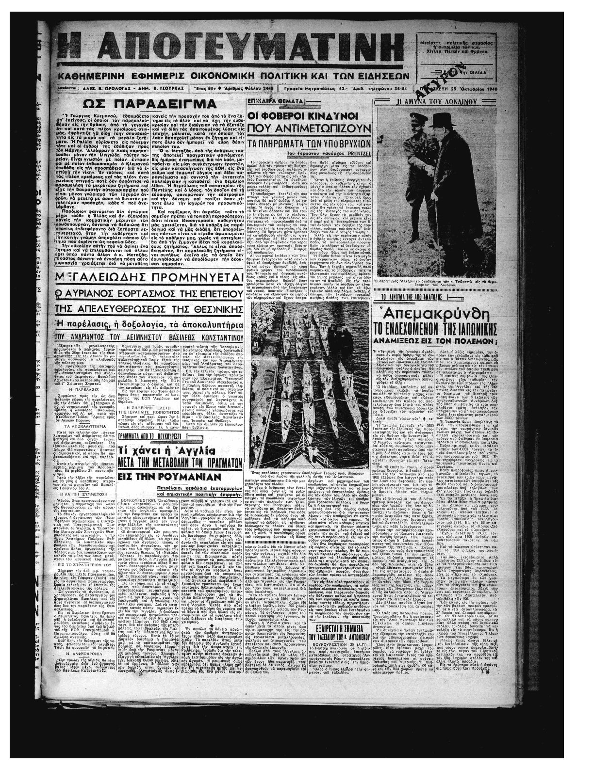 Παραμέσα, οδηγίες για συγκέντρωση υποζυγίων στο άλσος Παγκρατίου, ώστε να επιταχθούν, capital controls στις καταθέσεις (από τότε!) και απαγόρευση εξόδου από την επικράτεια. Στο πρόγραμμα του «Σινεάκ» ένα ωραίο φιλμάκι για τη Θεσσαλονίκη και καρτούν: «Ο Μίκυ και ο Πλούτων αλπινισταί, του Ντίσνεϊ»!
