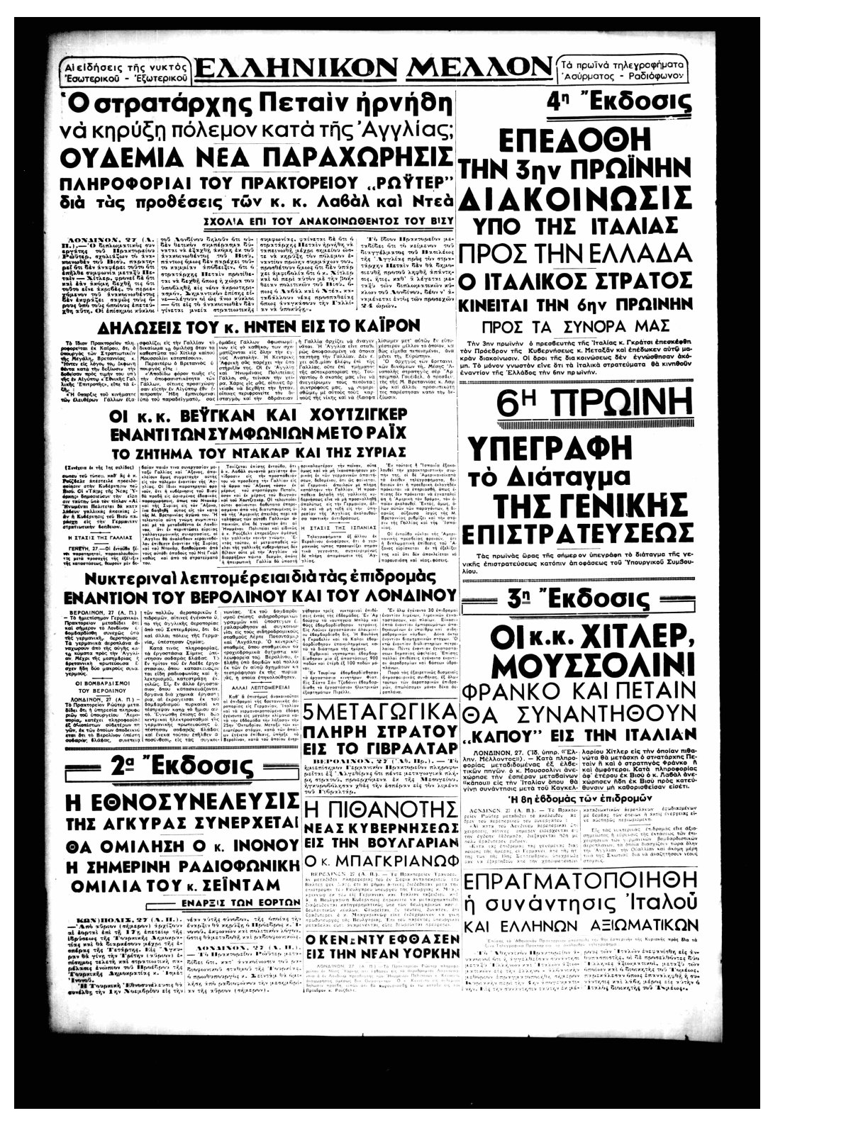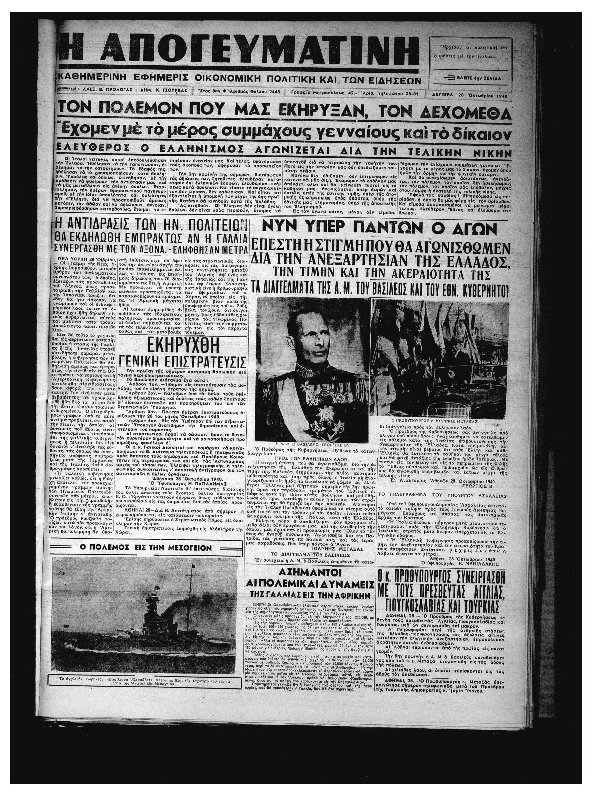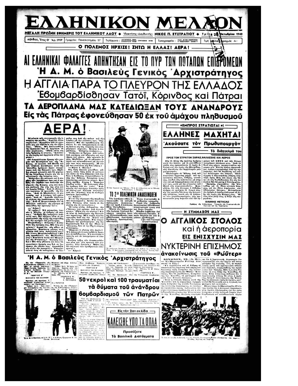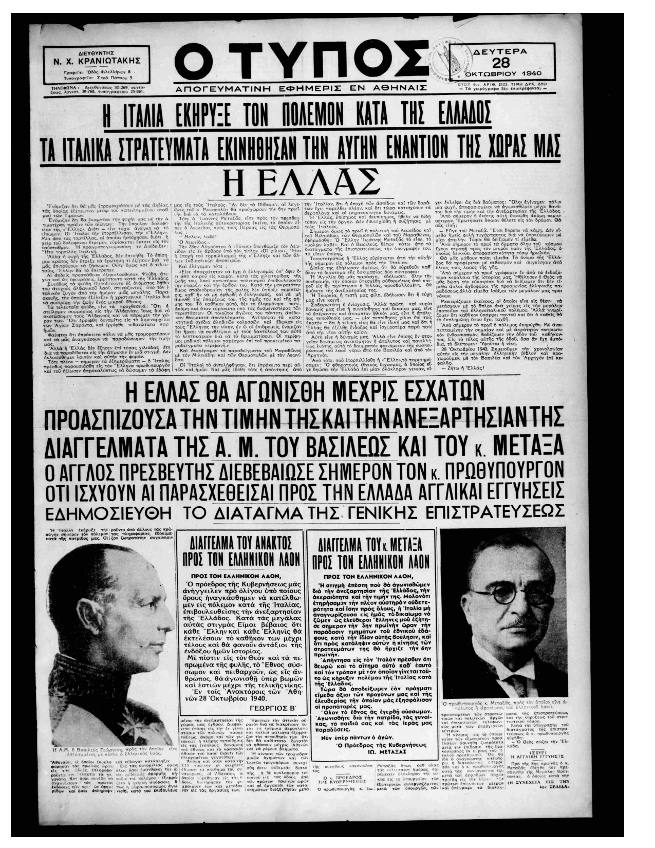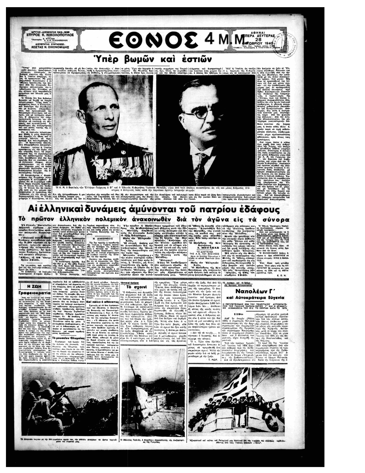 «Υπέρ βωμών και εστιών» τιτλοφορείται το editorial στο πάνω μέρος του πρωτοσέλιδου για την 28η Οκτωβρίου, με κεντρικές φωτογραφίες-πορτρέτα του Γεωργίου ΄Β και του Ιωάννη Μεταξά. Στο κάτω μέρος, φωτογραφίες του πεζικού με την «ασυγκράτητον ορμή» του, του «αθάνατου τσολιά» και οι ναυτικοί που υπηρετούσαν στο αντιτορπιλικό Έλλη.