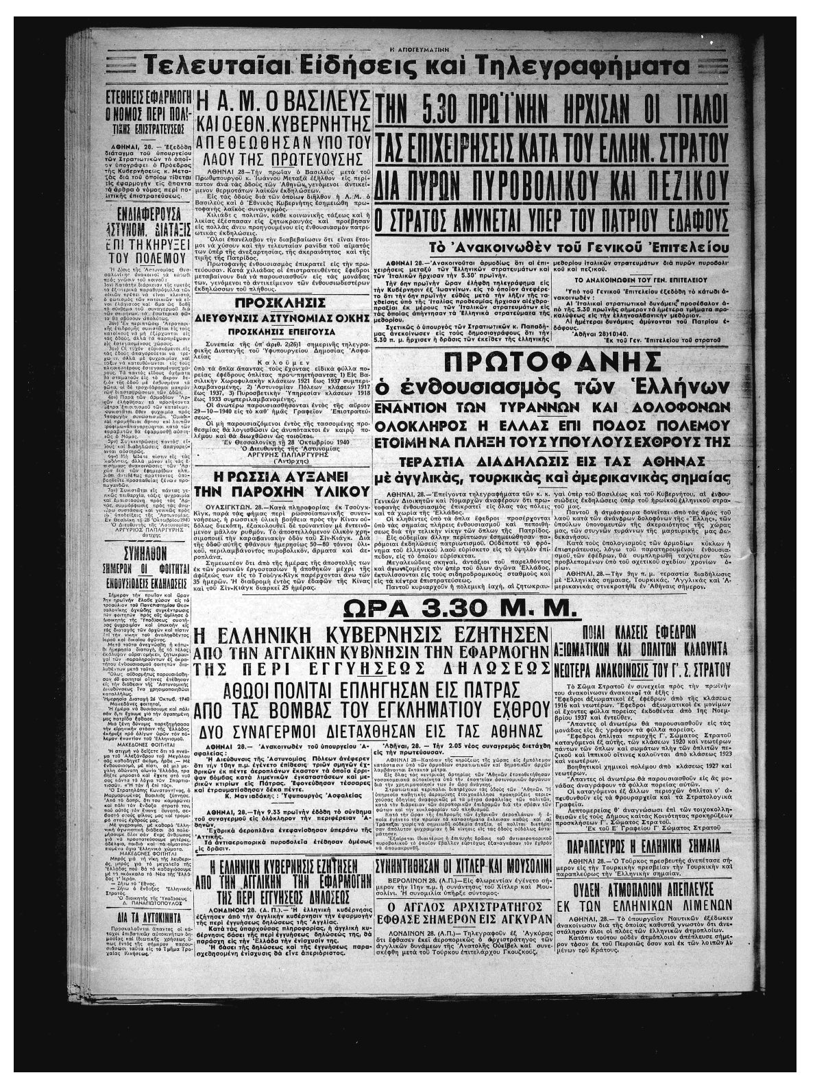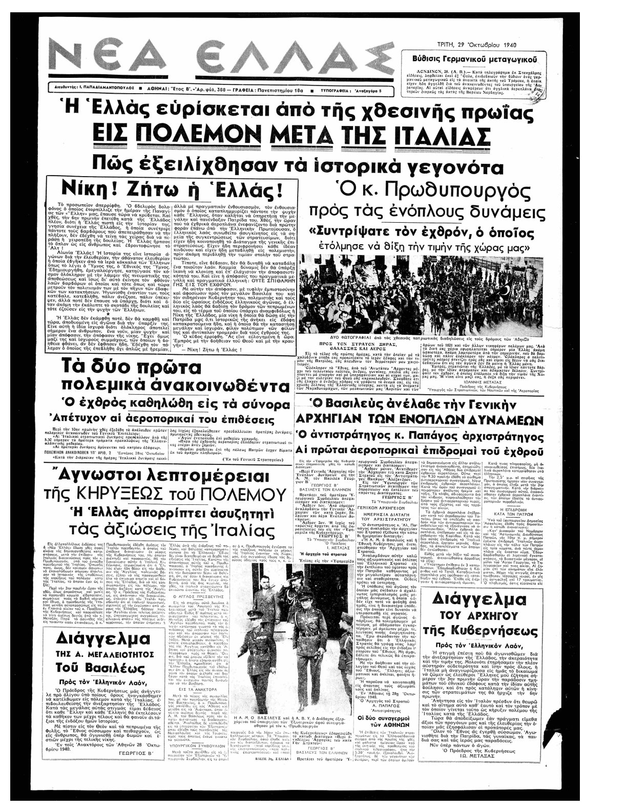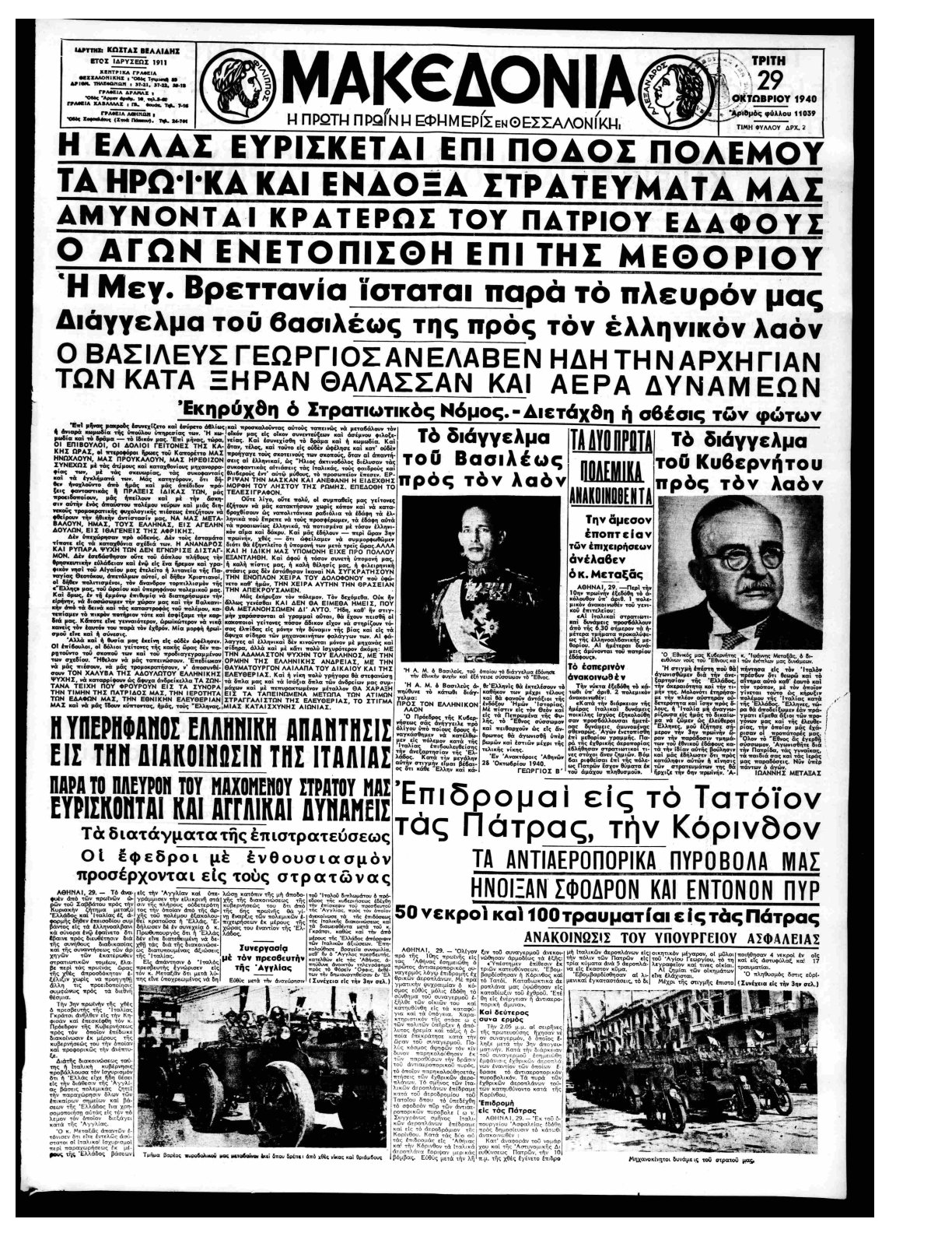 Τα διαγγέλματα βασιλιά και Ιωάννη Μεταξά περίμεναν και εδώ τους αναγνώστες στο φύλλο της 29ης Οκτωβρίου, μαζί με την είδηση ότι η Αγγλία θα στηρίξει την Ελλάδα στον πόλεμο, αλλά και τις πρώτες αναφορές για τα θύματα από αεροπορικές επιθέσεις: 50 νεκροί και 100 τραυματίες στην Πάτρα.