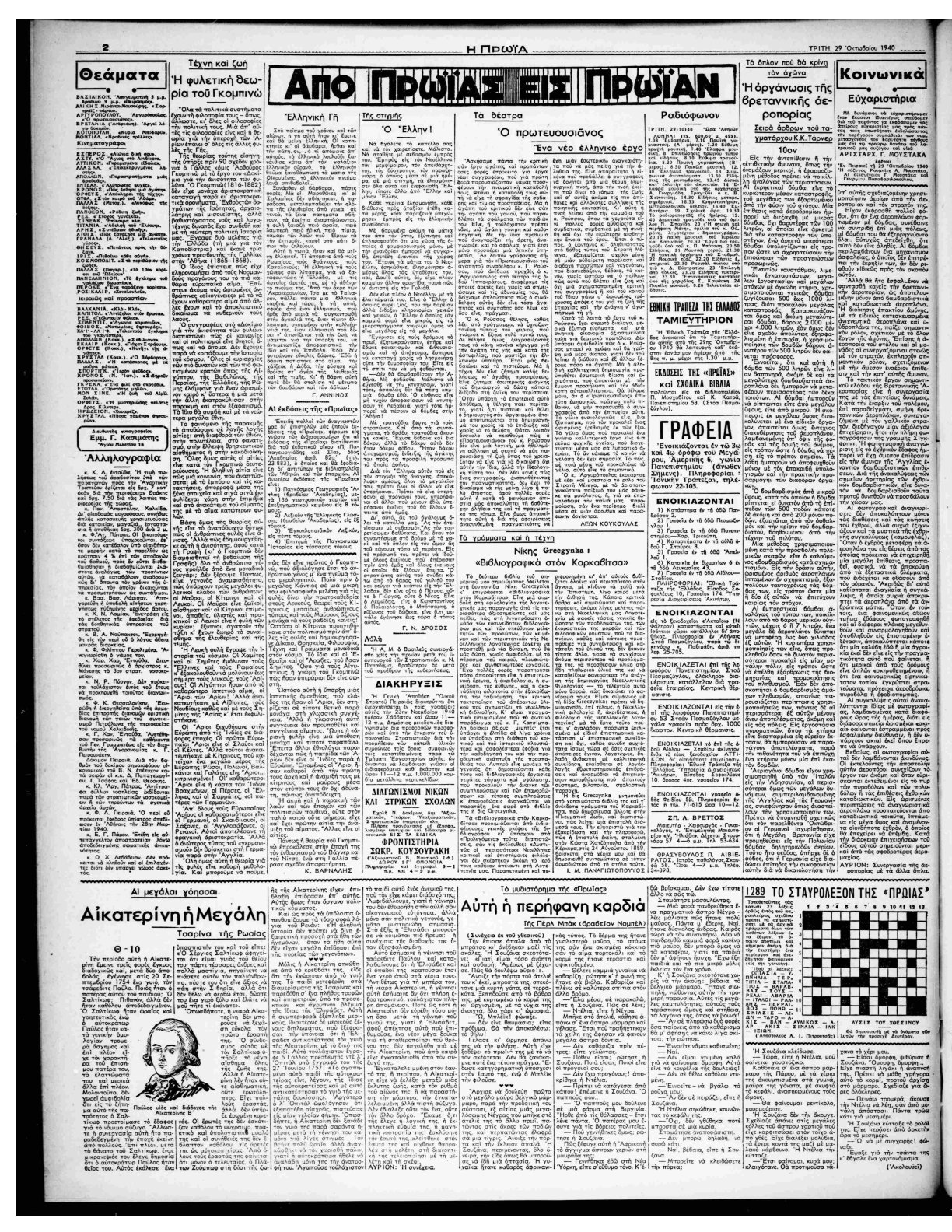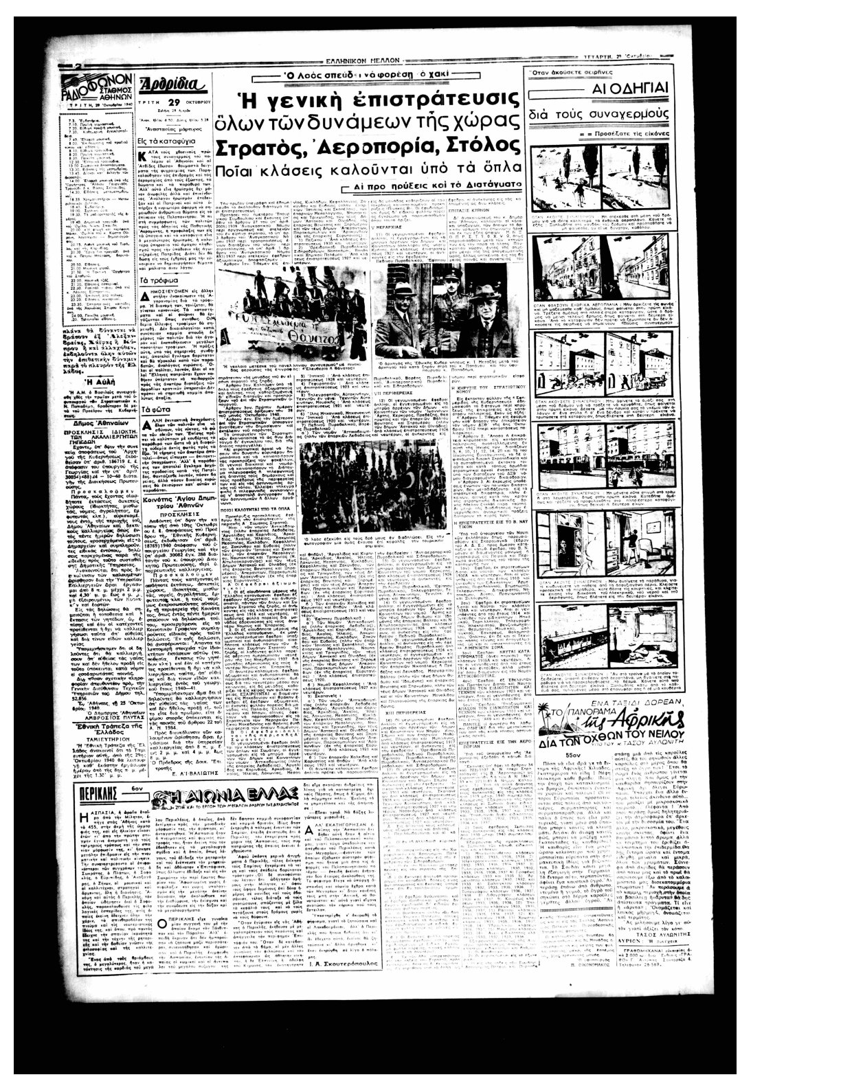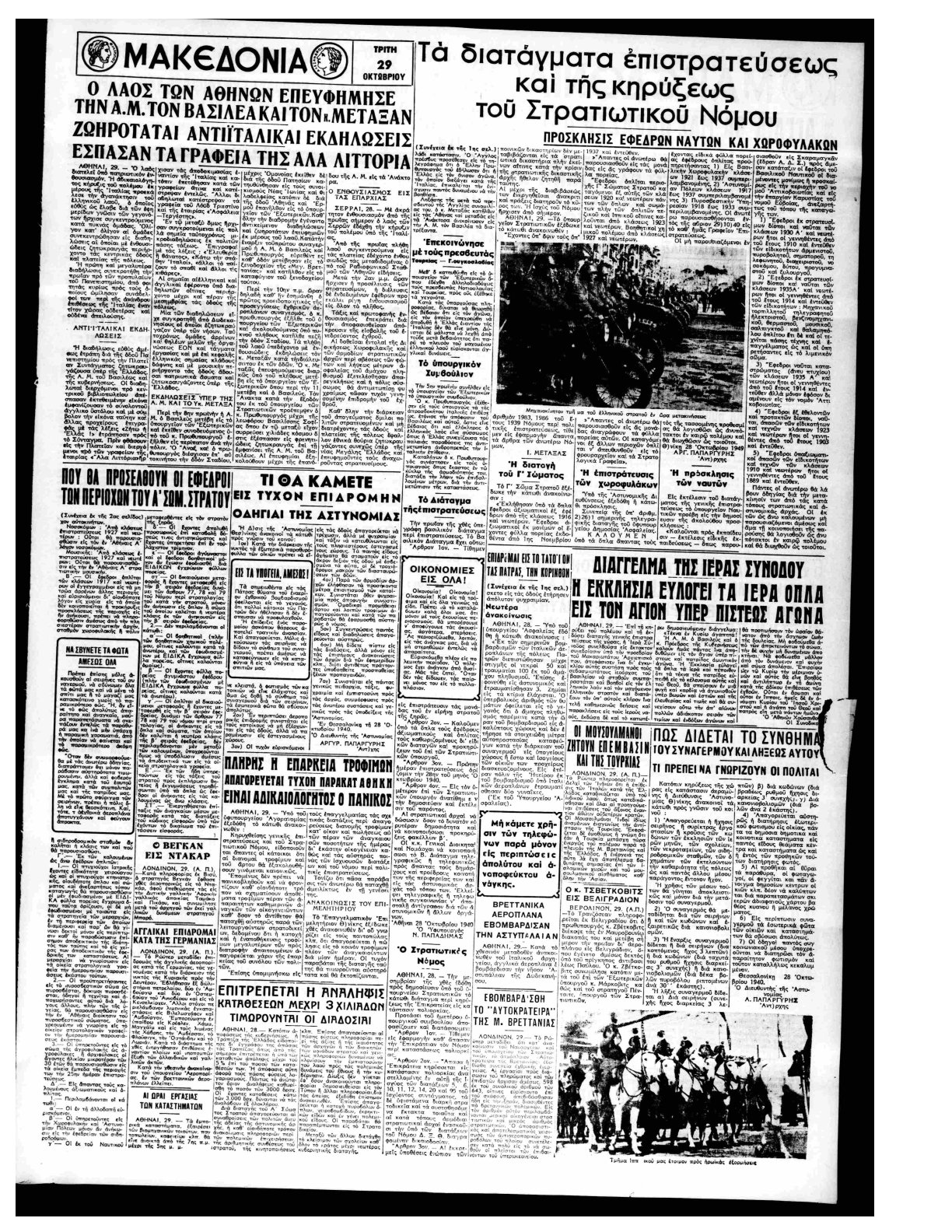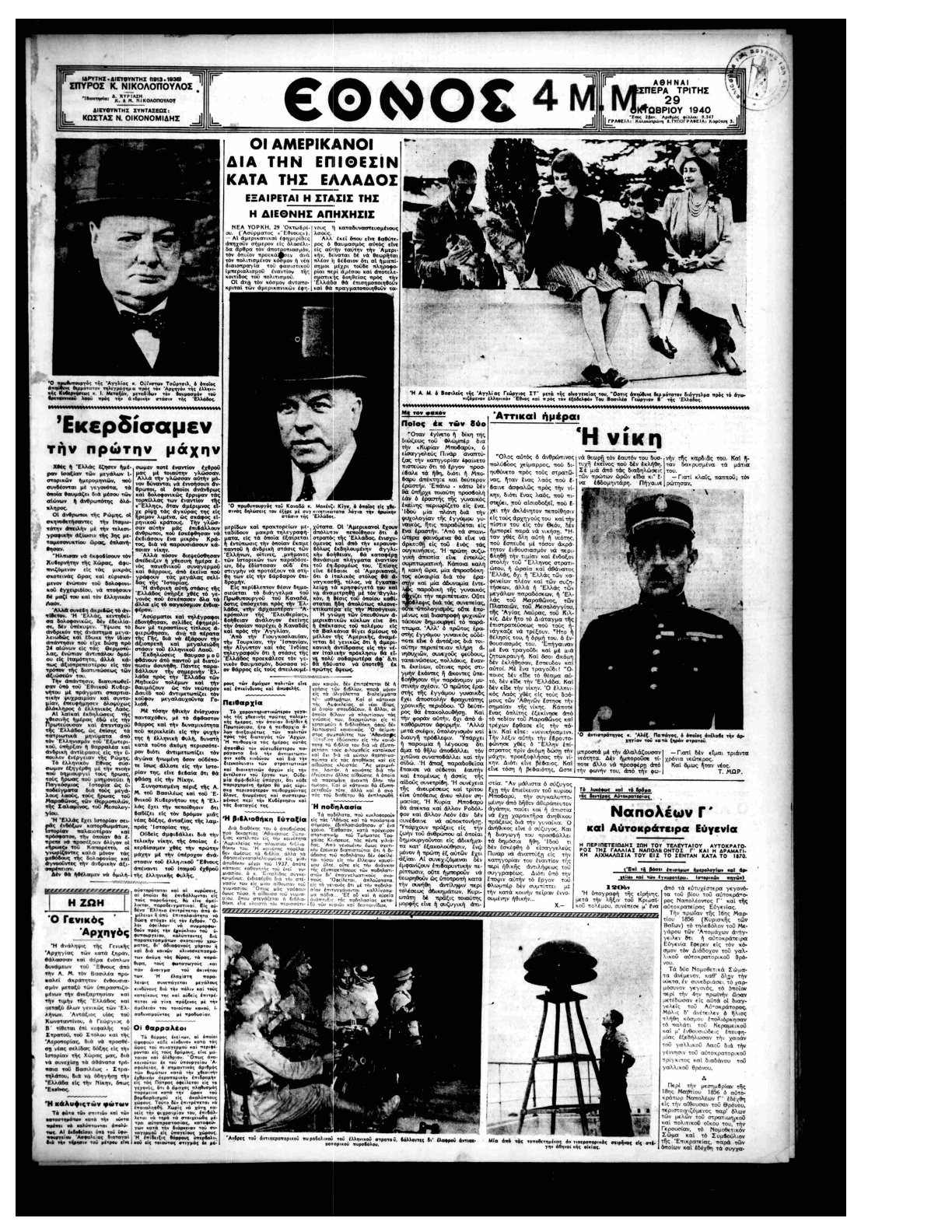 Τα διαγγέλματα βασιλιά και Ιωάννη Μεταξά περίμεναν και εδώ τους αναγνώστες στο φύλλο της 29ης Οκτωβρίου, μαζί με την είδηση ότι η Αγγλία θα στηρίξει την Ελλάδα στον πόλεμο, αλλά και τις πρώτες αναφορές για τα θύματα από αεροπορικές επιθέσεις: 50 νεκροί και 100 τραυματίες στην Πάτρα.
