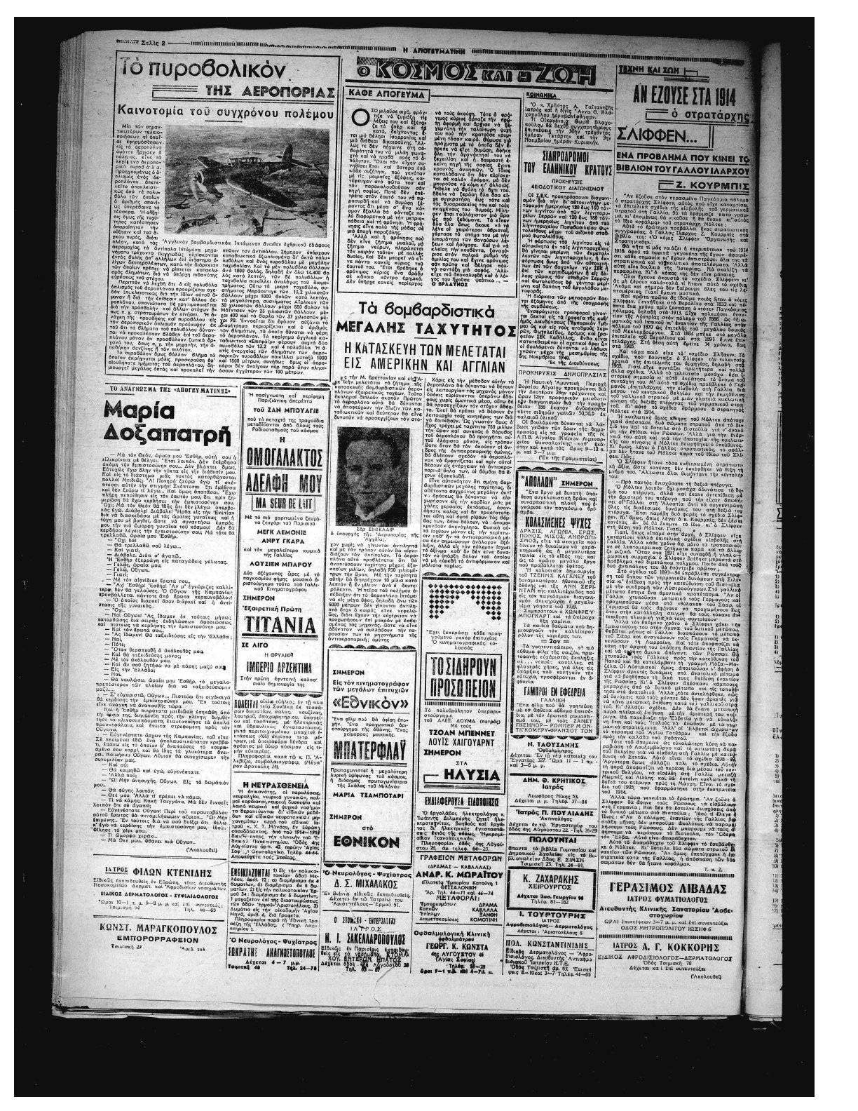 Αλλά στη δεύτερη σελίδα, η «κανονικότητα» διατηρείται με μυθιστορήματα σε συνέχειες και διαφημίσεις ανακατεμένες με αρθρογραφία για τον πόλεμο. Στο τελευταίο φύλλο, οι πρώτες αεροπορικές επιθέσεις, σε Πάτρα και Αθήνα, και διευκρινίσεις για το ποιες κλάσεις εφέδρων επιστρατεύονται.