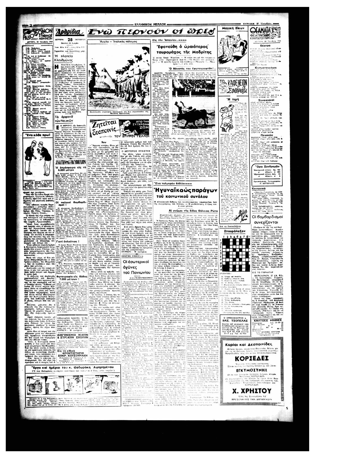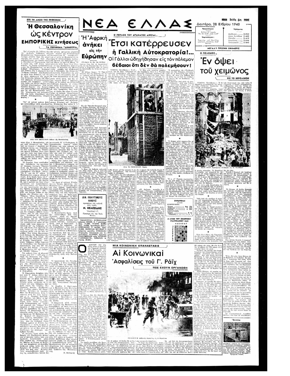 Διεθνής πολεμική επικαιρότητα και μυθιστόρημα σε συνέχειες και στο πρωτοσέλιδο της «Νέας Ελλάδος» την 28 Οκτωβρίου. Μαζί, ένα ενδιαφέρον άρθρο για τα «Δημήτρια» στη Θεσσαλονίκη και ρεπορτάζ για τις πολιτικές κοινωνικής ασφάλισης του ΄Γ Ράιχ, την πορεία των Γάλλων στον πόλεμο και την προετοιμασία του εμπόλεμου Βερολίνου για το χειμώνα.