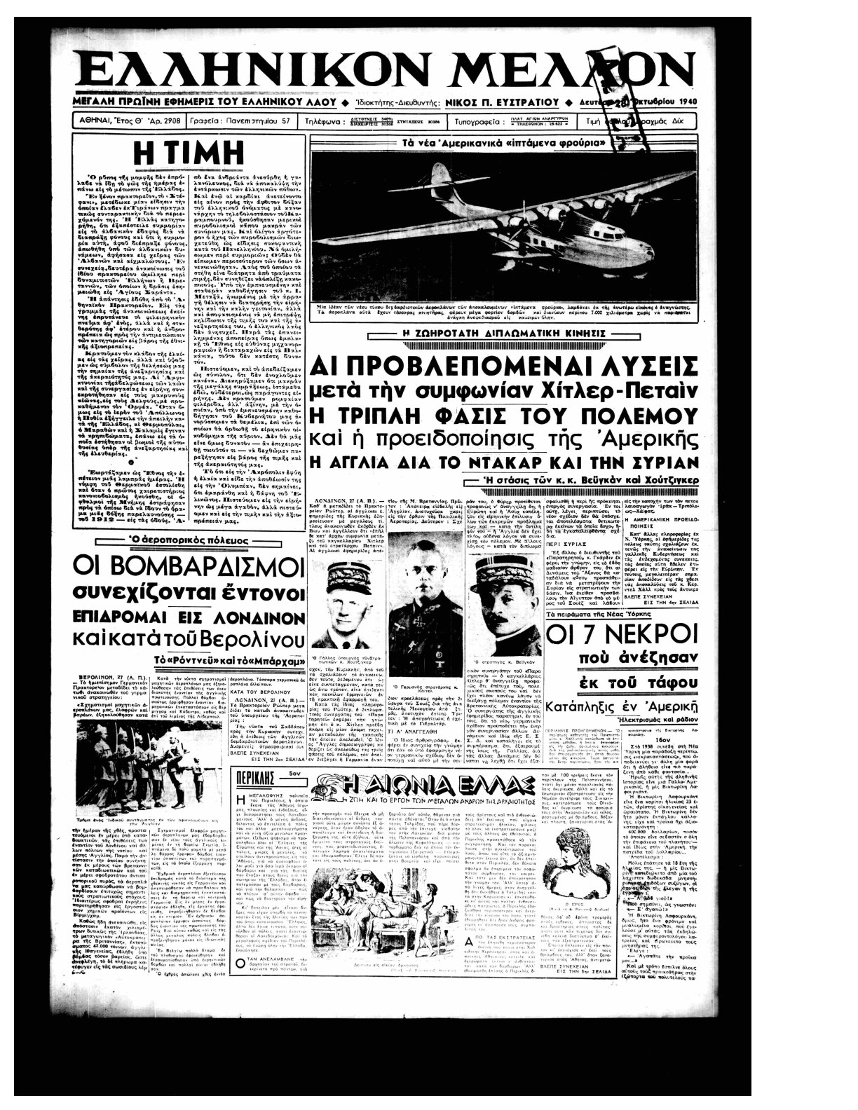 Αντίστοιχο σχολιασμό για το δημοσίευμα του πρακτορείου Στέφανι και την επαφή Χίτλερ-Πετέν και στο πρώτο από τα αθηναϊκά πρωτοσέλιδα που συγκεντρώσαμε, αυτό του «Ελληνικού Μέλλοντος» το πρωί της 28ης. Δεξιά προς τα κάτω μία περίεργη ιστορία… νεκρανάστασης με τη χρήση ηλεκτρισμού και του χημικού στοιχείου ράδιο. Κάτω, η στήλη «Η Αιώνια Ελλάς» με αφιέρωμα στα έργα και τις ημέρες του Περικλή.