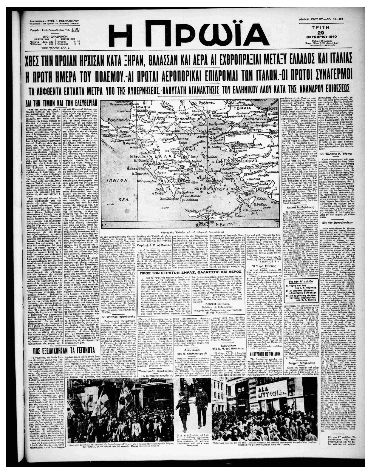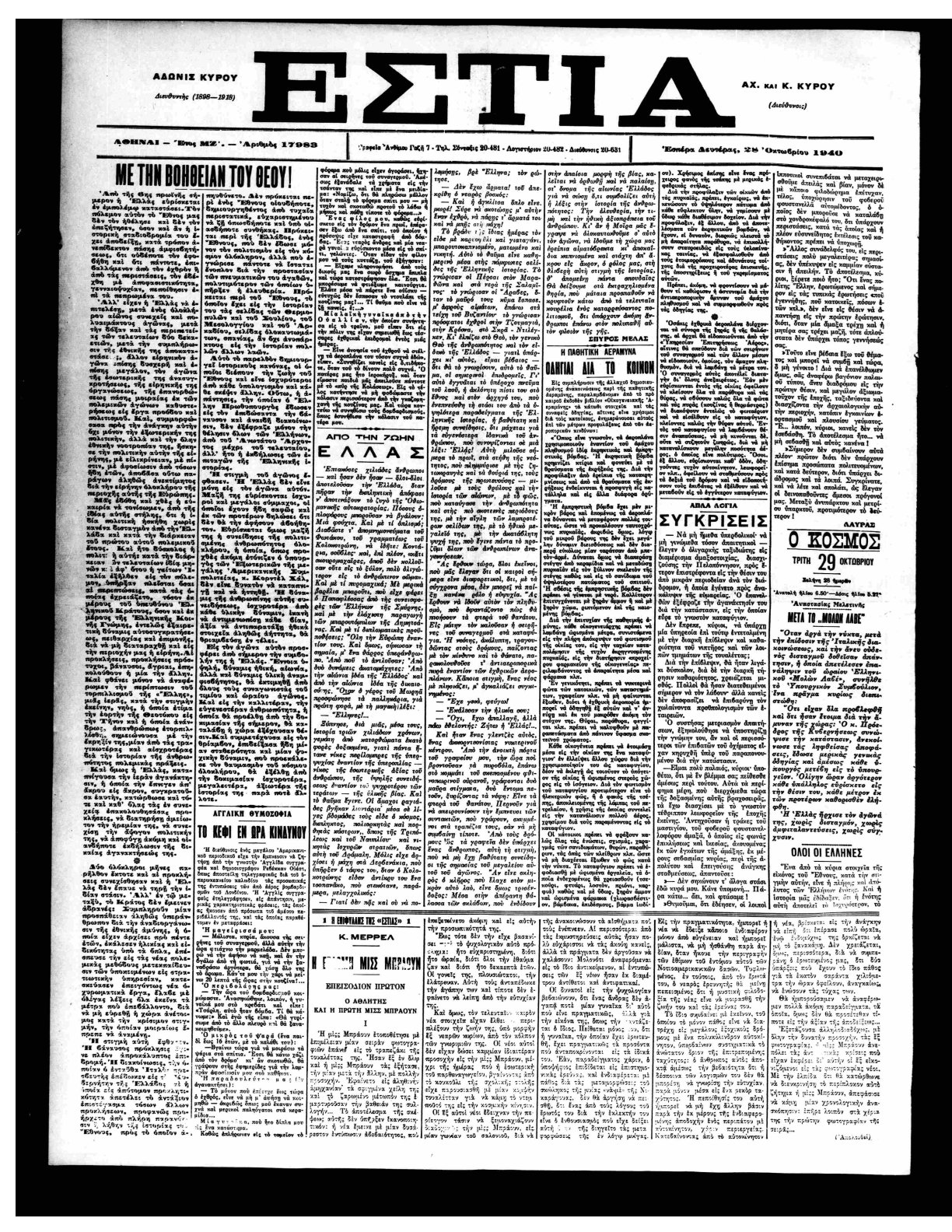 «ΜΕ ΤΗΝ ΒΟΗΘΕΙΑΝ ΤΟΥ ΘΕΟΥ!» υποδέχεται την κήρυξη του πολέμου η «Εστία» στο απογευματινό φύλλο της 28ης Οκτωβρίου, τονίζοντας τα ανδραγαθήματα του έθνους, τα οποία προορίζεται να επαναλάβει και τώρα. Μαζί ένα άρθρο του Σπύρου Μελά σε ανάλογο ύφος και οδηγίες παθητικής αεράμυνας.