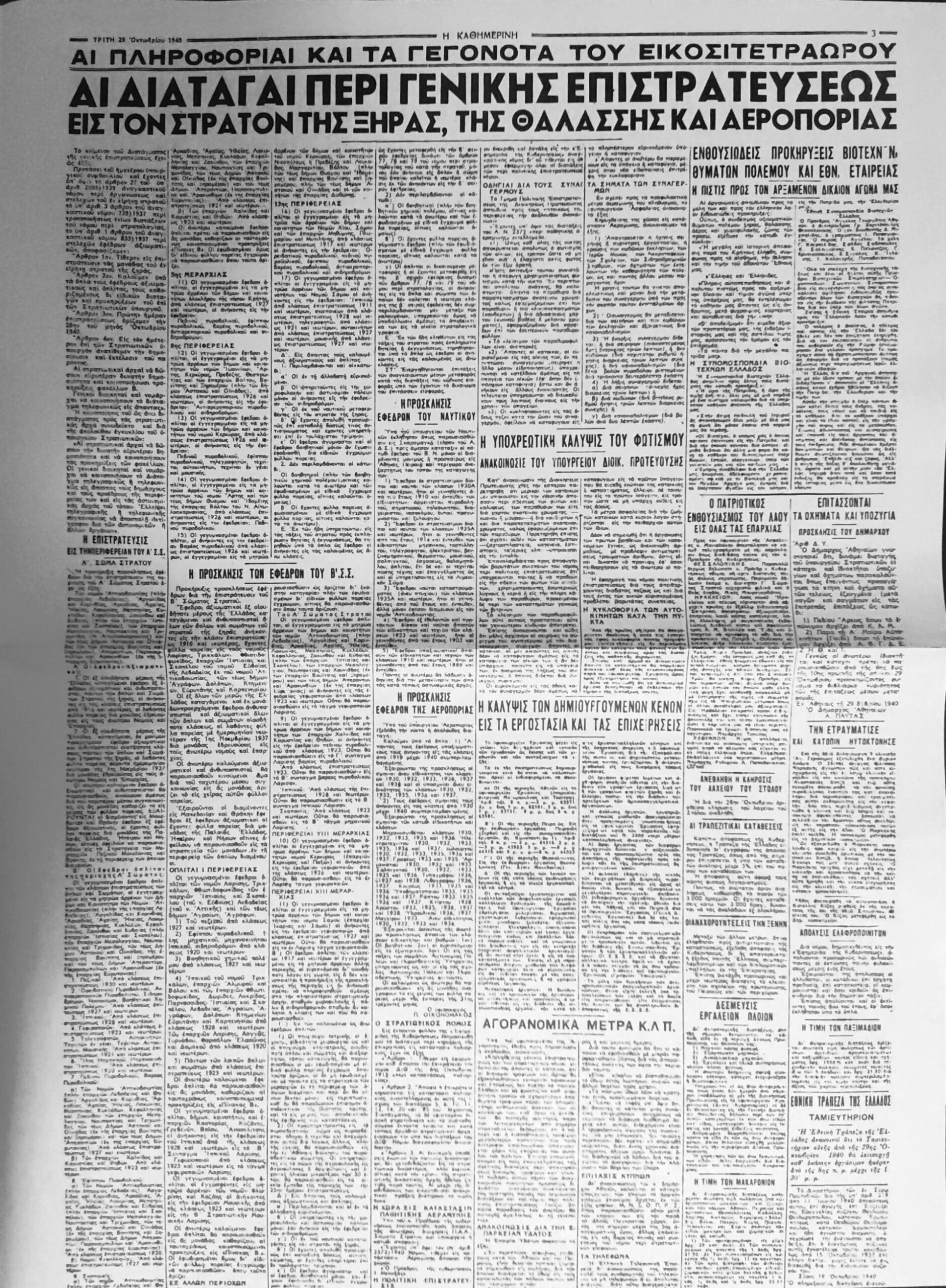Στο ιστορικό πρωτοσέλιδο της 28ης Οκτωβρίου, τα διαγγέλματα του Βασιλιά και του Μεταξά, μαζί με τις πληροφορίες της επιστράτευσης κυριαρχούν.