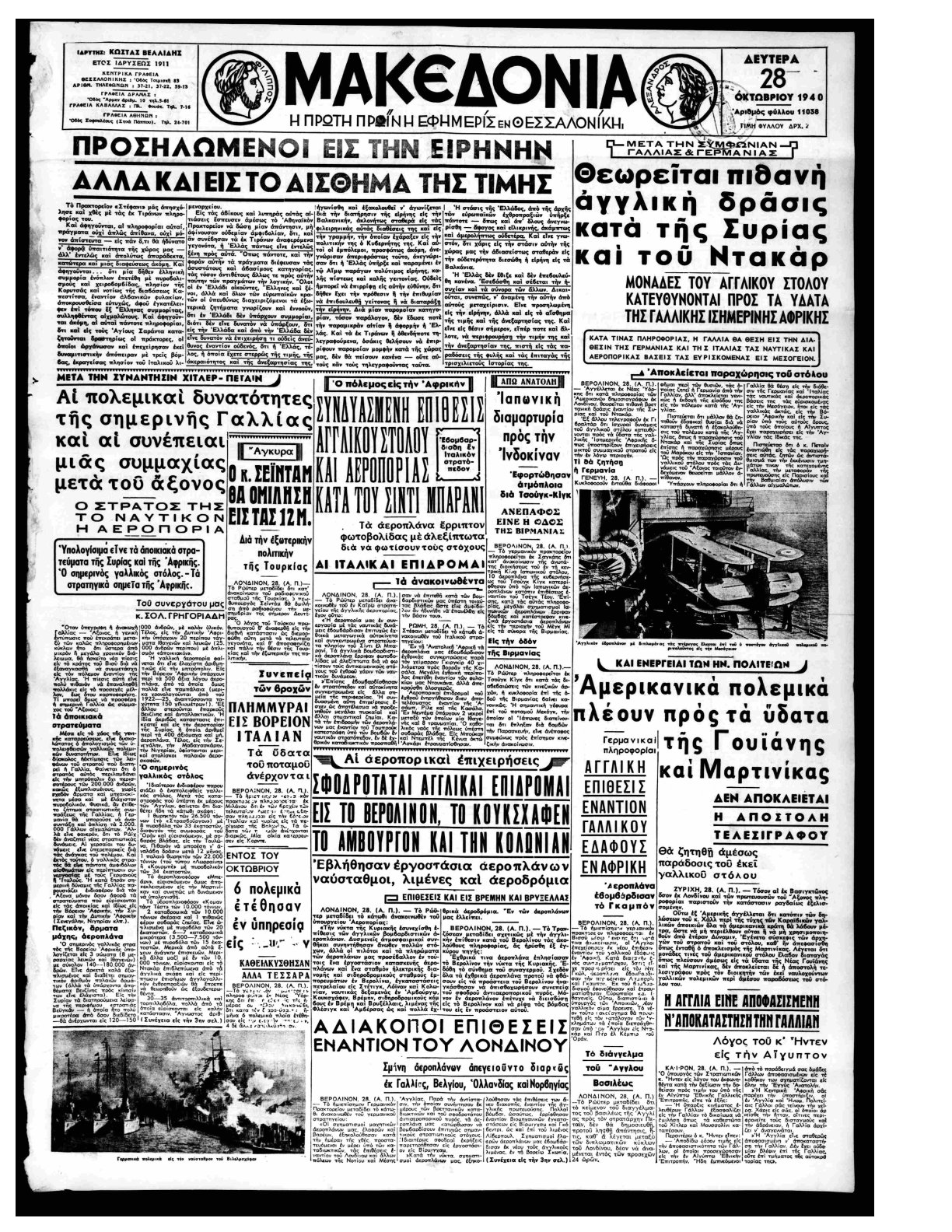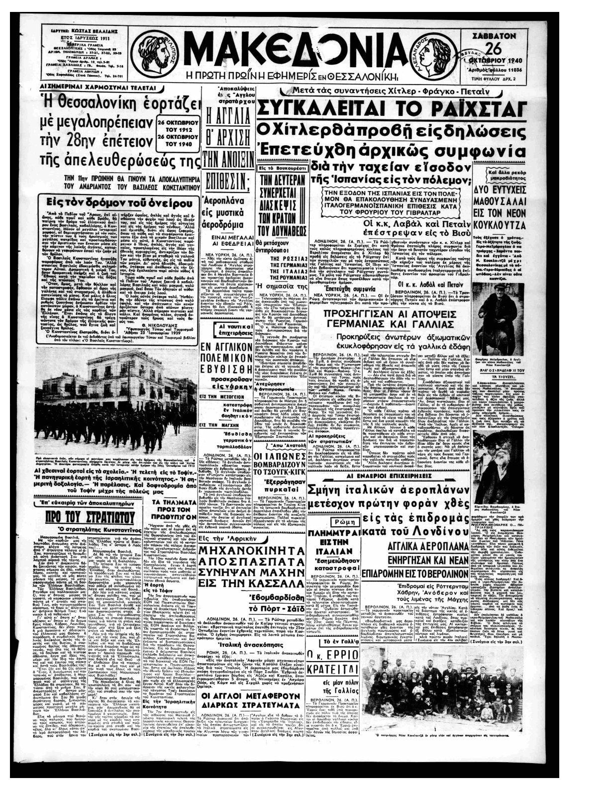 Αρκετά πιο «σφιχτό» το κλίμα στα πρωτοσέλιδα της Μακεδονίας, αφού ακόμα και ανήμερα της 26ης Οκτωβρίου οι πηχιαίοι τίτλοι αφιερώνονται στις διεθνείς πολεμικές εξελίξεις και όχι στους εορτασμούς της Θεσσαλονίκης. Συνάντηση Χίτλερ και στρατάρχη Πετέν (κυβέρνηση του Βισύ), βρετανικοί βομβαρδισμοί στο Βερολίνο («οι Γερμανοί χάνουν ένα αεροπλάνο κάθε 42 λεπτά αλλά κατασκευάζουν ένα άλλο κάθε 40!») και είσοδος της Ισπανίας στον πόλεμο. Φυσικά, υπήρξε και ένα φωτορεπορτάζ των εορτασμών, όπως συνήθιζε η Μακεδονία, μαζί με ειδησεογραφία, διαφημιστικές καταχωρήσεις και τα κοινωνικά.