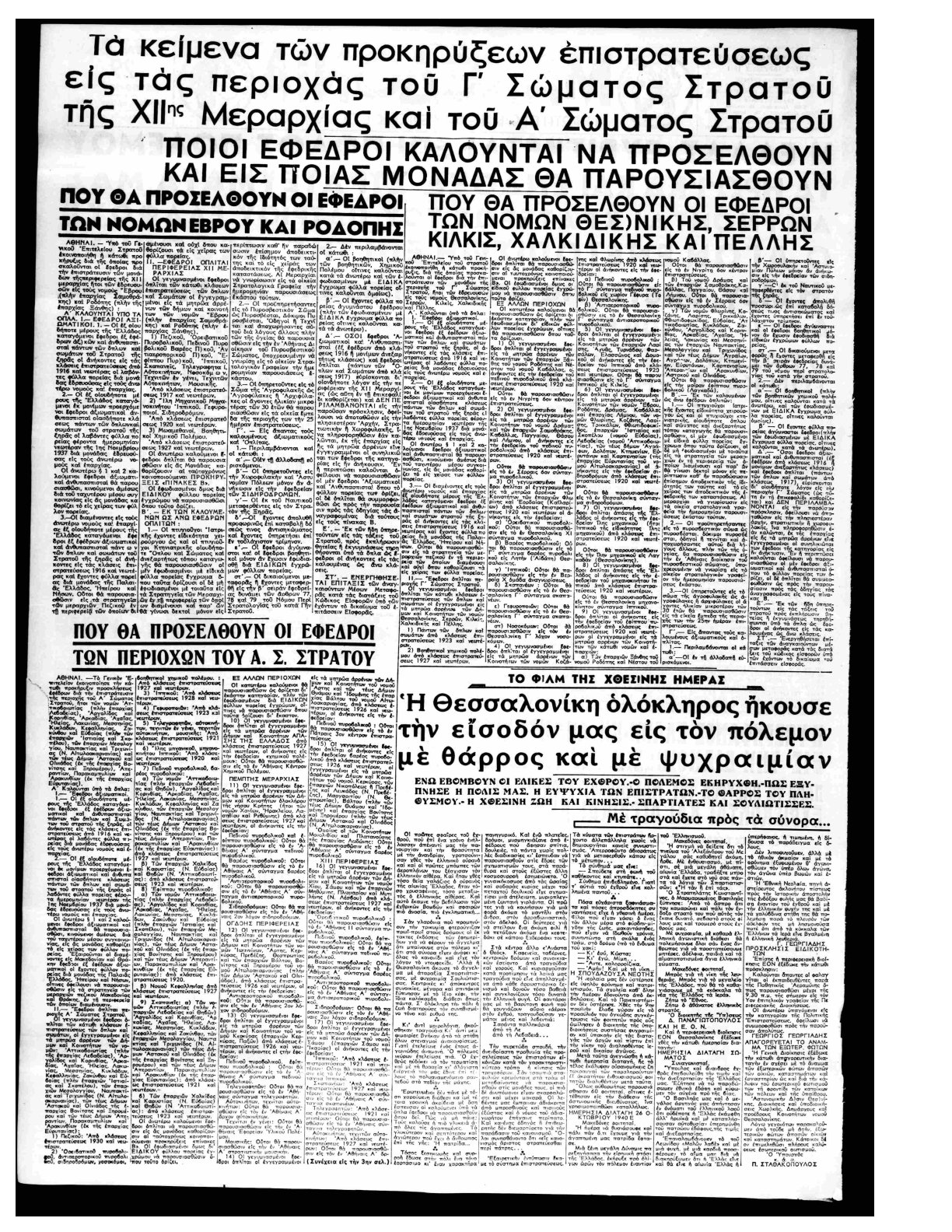 Στην επόμενη σελίδα, πληροφορίες για το πού θα προσέλθουν οι έφεδροι σε Θεσσαλονίκη, Σέρρες, Κιλκίς και Πέλλα, μαζί με περιγραφή του κλίματος σε όσους κλήθηκαν να πολεμήσουν: «Ερωτευμένοι δεν πάνε με τόση χαρούμενη διάθεση και με τέτοια χρονική ακρίβεια με όση έσπευσαν οι καλούμενοι υπό τα όπλα έφεδροι να παρουσιασθούν όπου δει». Στην τρίτη σελίδα, διάγγελμα της Ιεράς Συνόδου, καθυσηχαστήρια μηνύματα για την επάρκεια τροφίμων και οδηγίες για την προφύλαξη από τους βομβαρδισμούς.