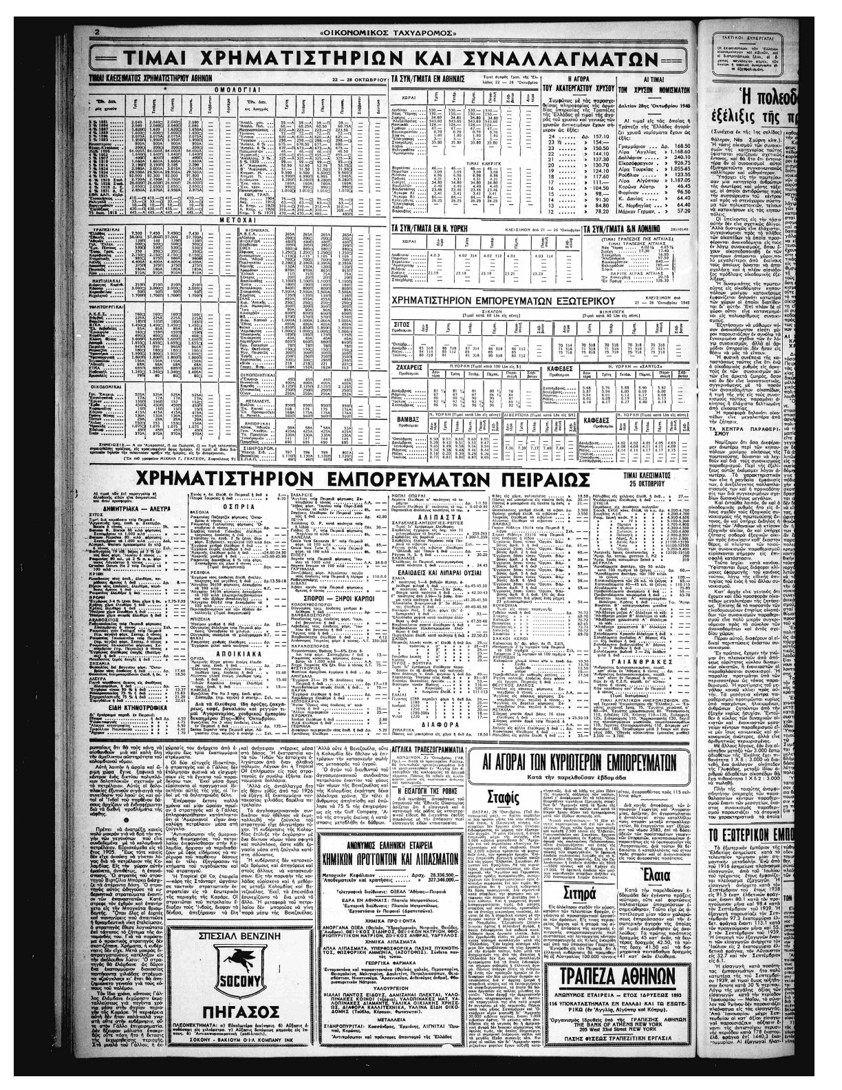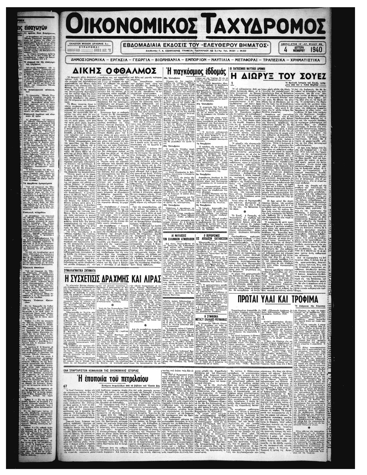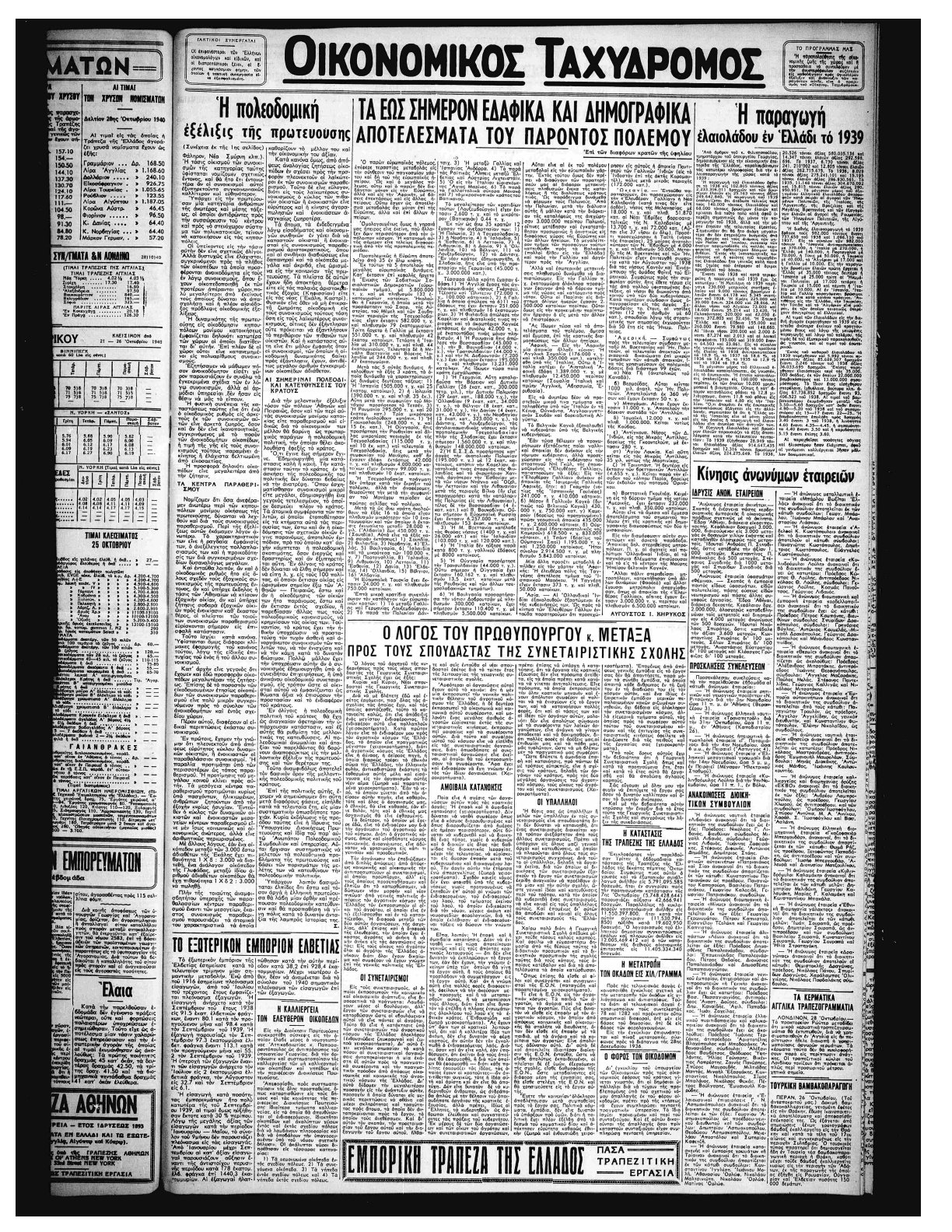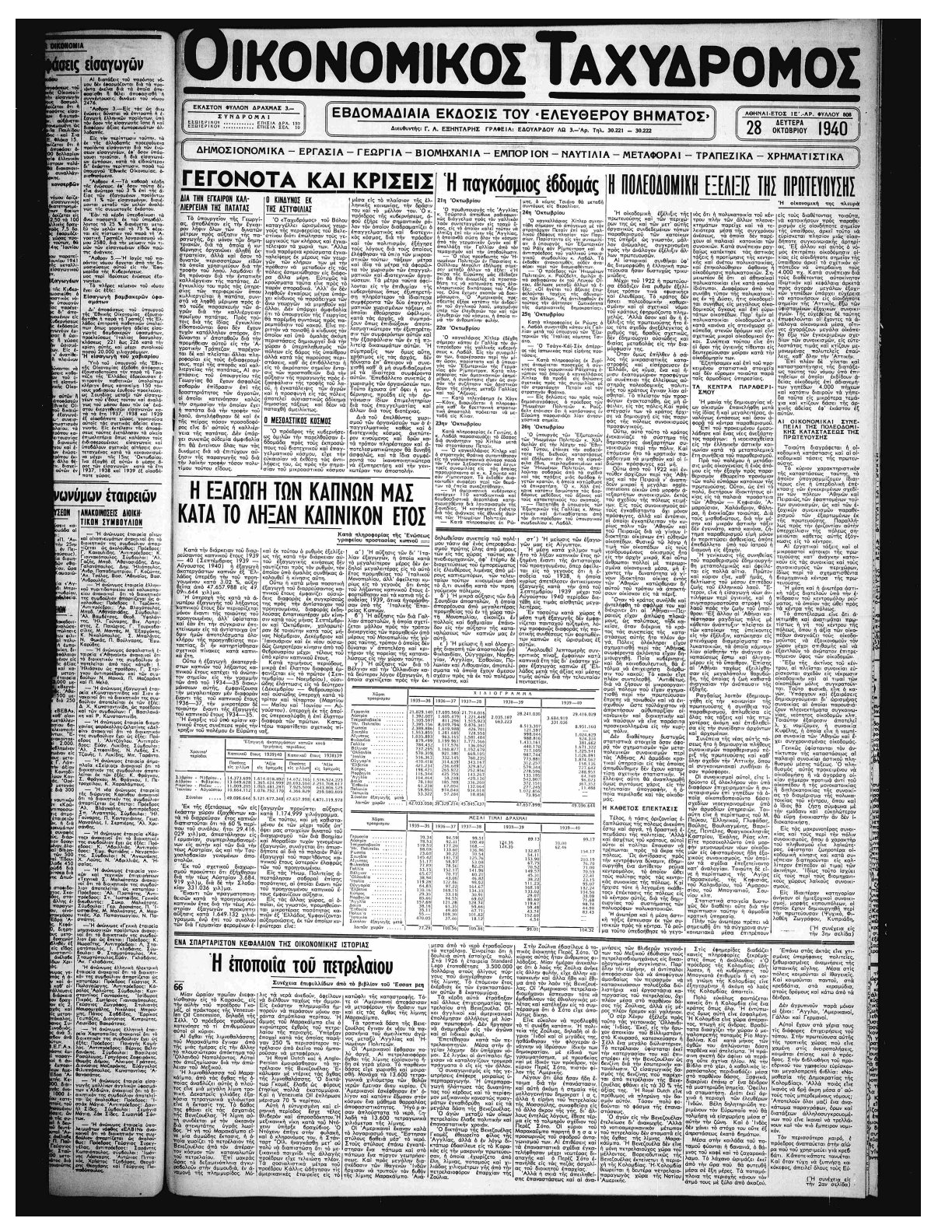 Ο εβδομαδιαίος «Οικονομικός Ταχυδρόμος» κυκλοφόρησε στις 28 Οκτωβρίου με ύλη καθόλα συνηθισμένη: η πολεοδομική εξέλιξη της Αθήνας, η παραγωγή ελληνικού ελαιόλαδου το 1939, τραπεζικές συναλλαγές, κινήσεις εταιρειών. Και κεντρικό θέμα οι εδαφικές και δημογραφικές αλλαγές που έφερε ο ευρωπαϊκός (ακόμα) νέος πόλεμος.