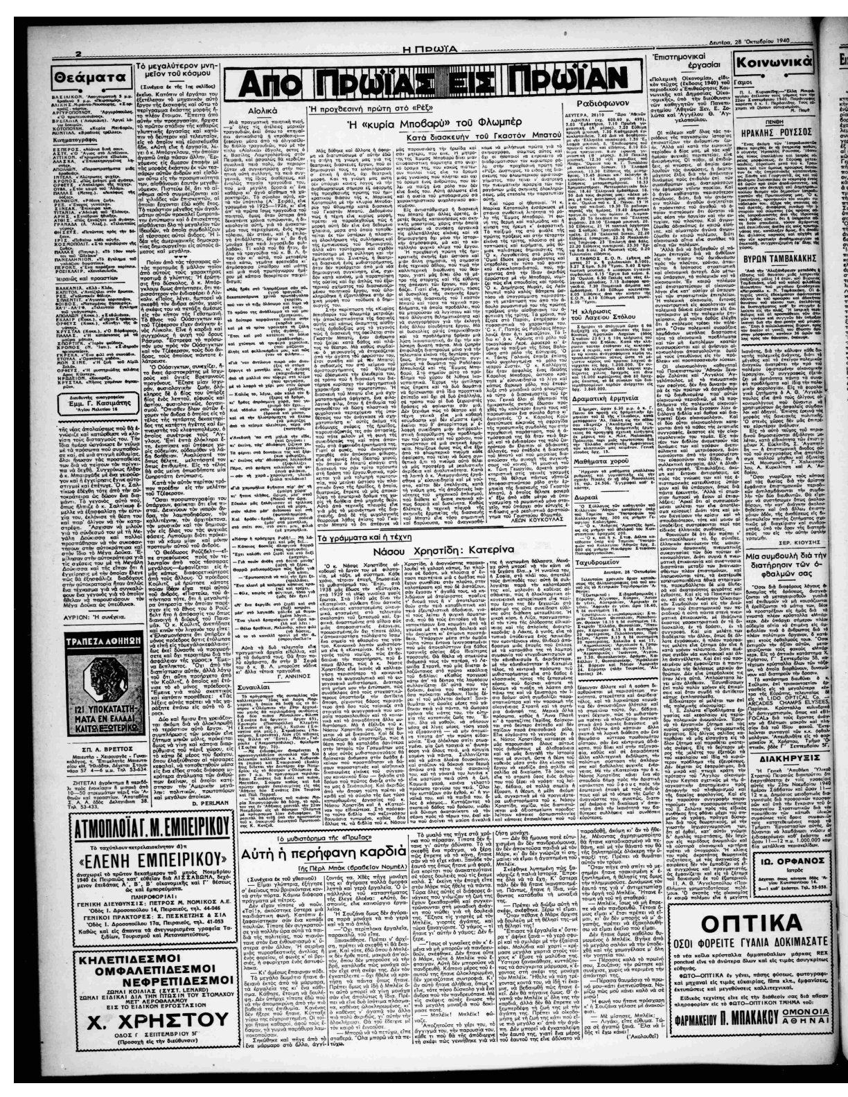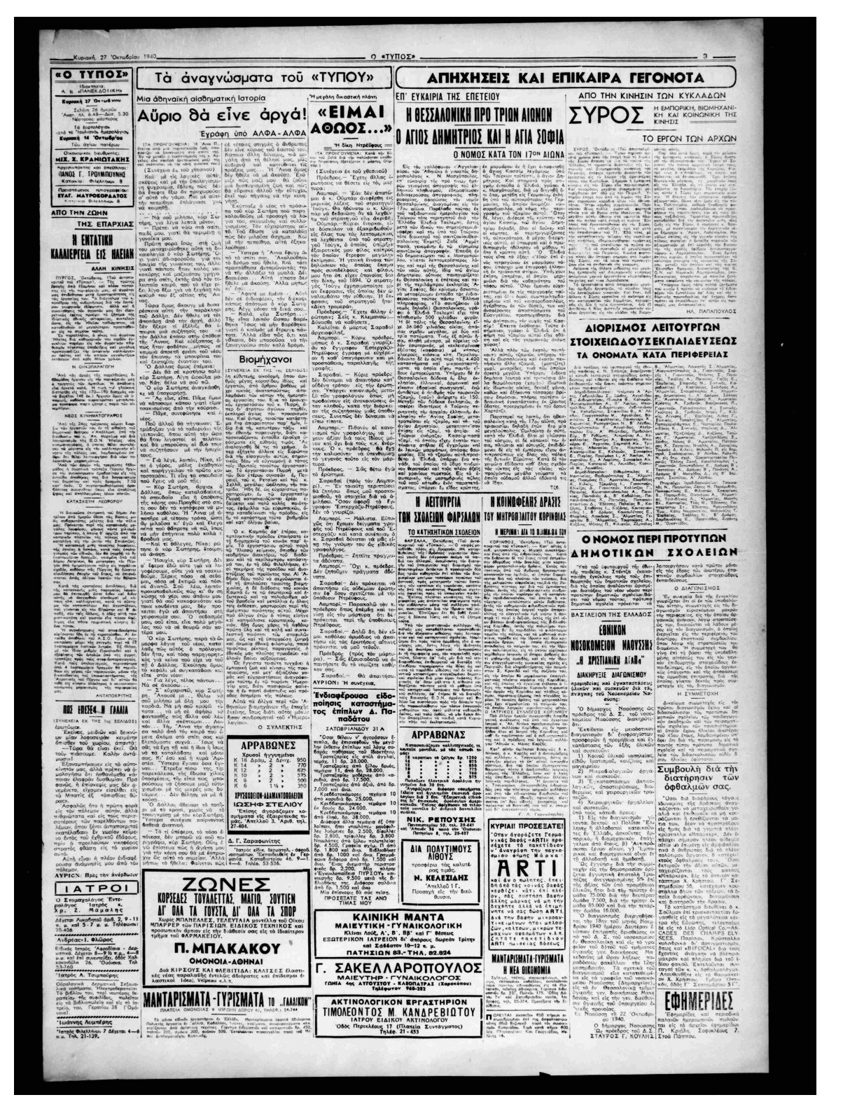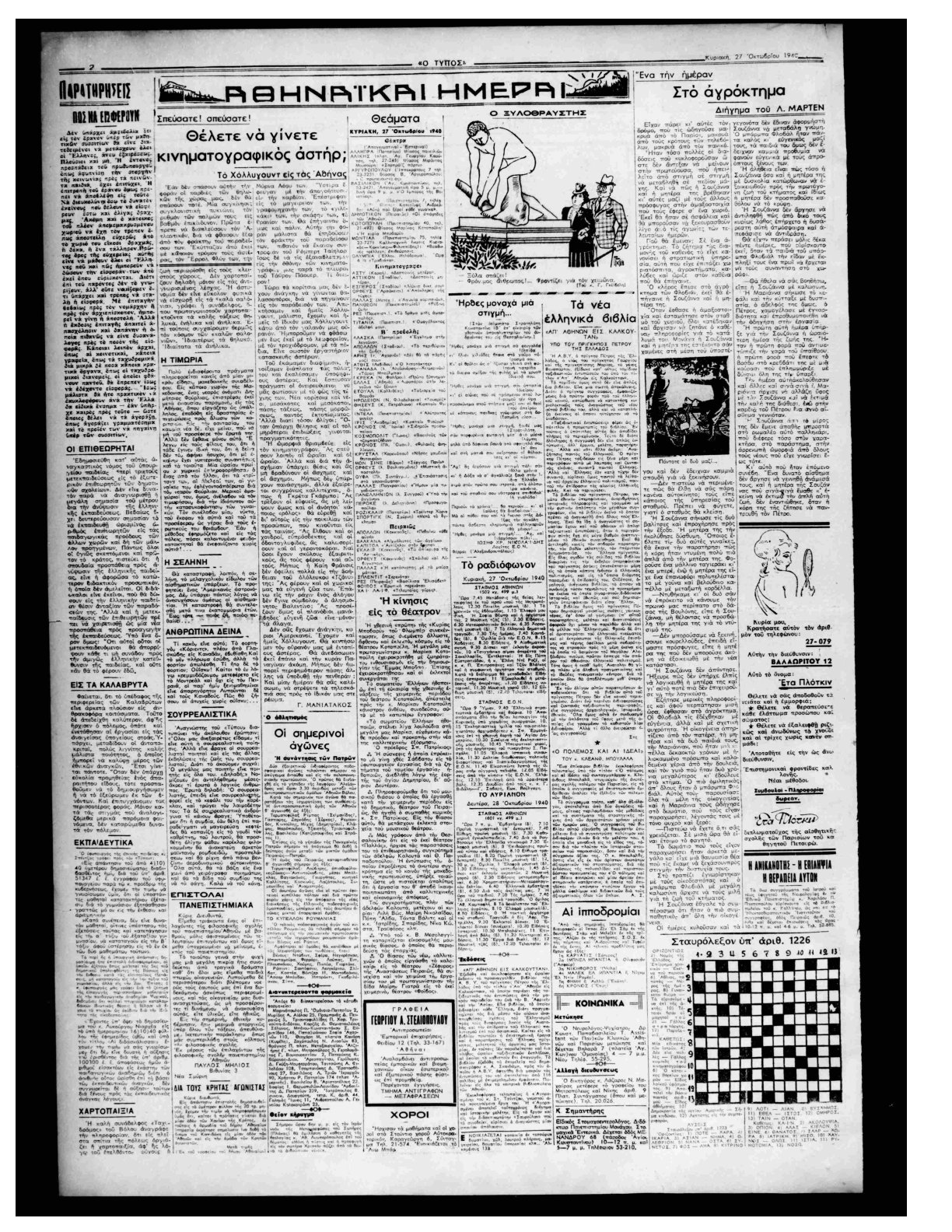 Ενδιαφέρον έχουν οι μέσα σελίδες του «Τύπου» της 27ης Οκτωβρίου, όπου διαβάζουμε διαφήμιση προς νέους «κινηματογράφικούς αστέρες» ότι έρχεται «Το Χόλυγουντ εις τας Αθήνας». Παραδίπλα, η ύλη θυμίζει ήσυχο πρωί Κυριακής, με πρόγραμμα θεαμάτων και τα νέα ελληνικά βιβλία που κυκλοφορούν. Στην τρίτη σελίδα και εδώ άρθρο ιστορικού ενδιαφέροντος για τη Θεσσαλονίκη: «Η Θεσσαλονίκη προ τριών αιώνων: Ο Άγιος Δημήτριος και η Αγία Σοφία».