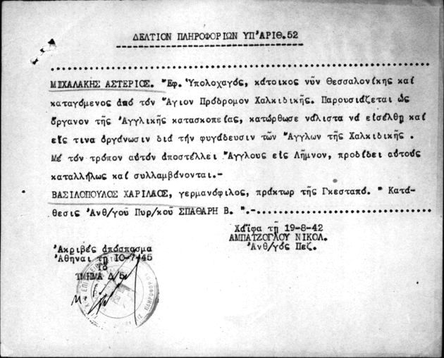 Για τον Αστέριο Αντωνίου Μιχαλάκη, τον Δάγκουλα αυτόν της Κασσάνδρας, που άνοιξε 35 τάφους, έστησε τρεις αγχόνες και έστειλε 80 Κασσανδρινούς στα κάτεργα της Γερμανίας, έχω να πω ότι οδήγησε στην Κασσάνδρα αυτός προσωπικώς τους 300 Γερμανούς των S.S…».