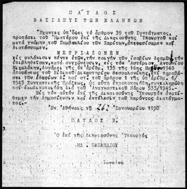 Η ποινή μετριάστηκε στις 26 Ιανουαρίου 1950 σε πέντε χρόνια φυλάκιση με απόφαση που υπέγραφαν ο βασιλεύς Παύλος και ο υπουργός Δικαιοσύνης Ηλίας Παπαηλιού.
