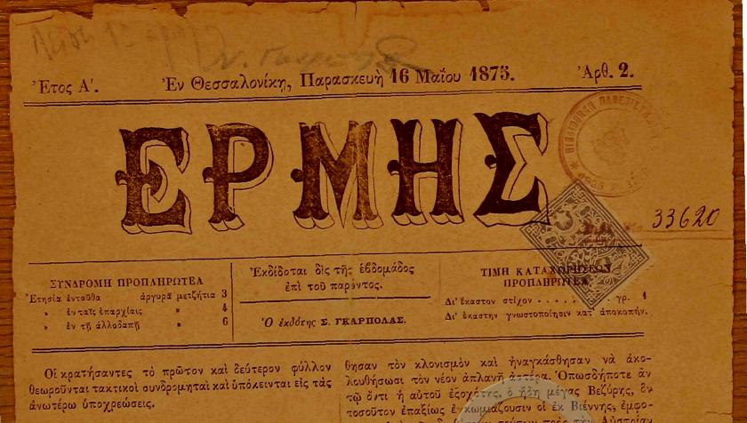 Λογοτεχνικά κείμενα περιελάμβανε στην ύλη της και η πρώτη εφημερίδα ο Ερμής (1875-1881) του Σοφοκλή Γκαρπολά, που συνέχισε την έκδοσή της με τον τίτλο Φάρος της Μακεδονίας (1881-1895), μετονομαζόμενη κατόπιν Φάρος της Θεσσαλονίκης (1900-1912).