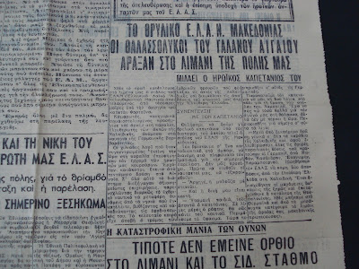 -15 Αυγούστου 1944. Στις ακτές του Αγίου Όρους συλλαμβάνεται κατόπιν συνδυασμένης επιχείρησης της 6ης Μοίρας του ΕΛΑΝ, με άνδρες και του εφεδρικού ΕΛΑΣ Χαλκιδικής, το γερμανικό επίτακτο Άγιος Νικόλαος που μετέφερε εφόδια στη φρουρά της Λήμνου. Λάφυρα ένα πυροβόλο των 10,5 cm, ένας τόνος δυναμίτη, τρία τυφέκια, 4 πιστόλια, 100 γυλιοί κλπ. -18 Αυγούστου 1944. Από το ΕΛΑΝ Θερμαϊκού αιχμαλωτίσθηκε το γερμανικό επίταχτο πετρελαιοκίνητο «Παναγιά» και πάρθηκαν λάφυρα. -20 Αυγούστου 1944. Από το ΕΛΑΝ Θερμαϊκού αιχμαλωτίσθηκε το γερμανικό επίταχτο πετρελαιοκίνητο «Άγιος Κωνσταντίνος» φορτωμένο με πετρέλαιο.