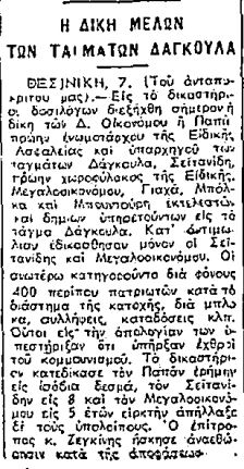 Είναι χαρακτηριστικό ότι τις ίδιες μέρες που γινόταν η δίκη των έξι συμμοριτών του Δάγκουλα, το Δικαστήριο Δοσιλόγων της Θεσσαλονίκης επέβαλε σε έναν από τους άνδρες του τάγματος Βήχου, ενός άλλου διαβόητου συμμορίτη, τον Κωνσταντίνο Τουτουντζόγλου, ποινή φυλάκισης μόλις έξι μηνών για την εκτέλεση ενός πολίτη, του Σίμου Γεμενετζή, έξω από καφενείο στην οδό Αγίου Δημητρίου.