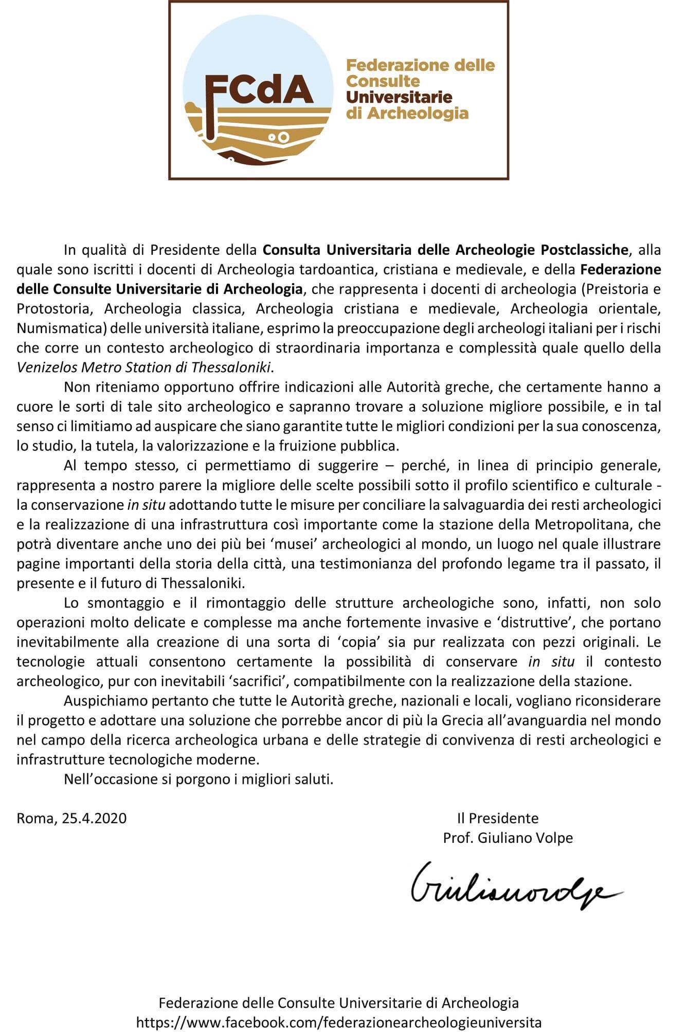 Ως Πρόεδρος του Πανεπιστημιακού Συμβουλίου της Μετακλασικής Αρχαιολογίας, που εκπροσωπεί Καθηγητές της Υστερορρωμαϊκής, Χριστιανικής και Μεσαιωνικής Αρχαιολογία και ως Πρόεδρος της Ομοσπονδίας των Πανεπιστημιακών Συμβουλίων Αρχαιολογίας, που εκπροσωπεί τους Καθηγητές Αρχαιολογίας (Προϊστορία και Πρωτοϊστορία, Κλασική, Χριστιανική και Μεσαιωνική αρχαιολογία, αρχαιολογία Ανατολικών Λαών, Νομισματική) των ιταλικών πανεπιστημίων, εκφράζω την ανησυχία των Ιταλών αρχαιολόγων για τους κινδύνους που διατρέχει ένα σύνθετο αρχαιολογικό σύνολο εξαιρετικής σημασίας, όπως αυτό του Σταθμού Βενιζέλου στο Μετρό στη Θεσσαλονίκης.