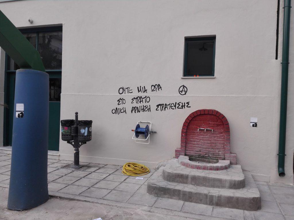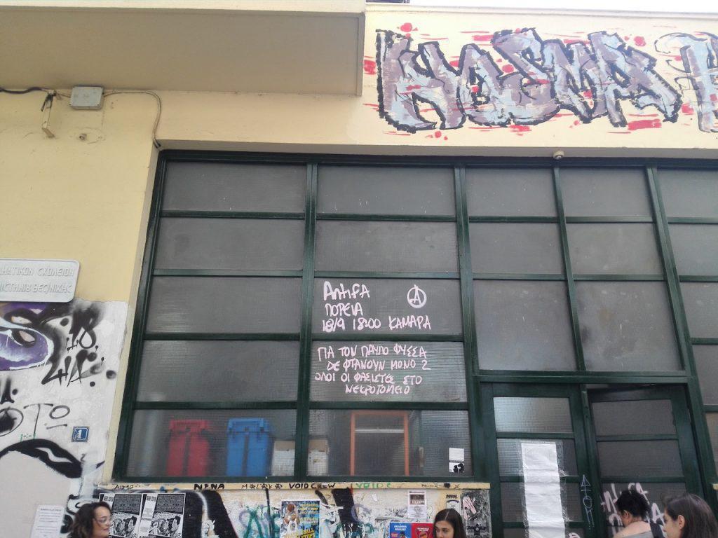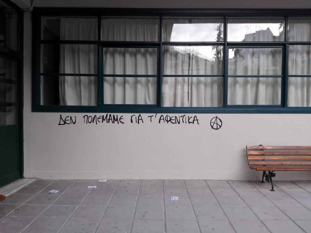 Άγνωστοι προκάλεσαν φθορές γράφοντας στους τοίχους του Πειραματικού Σχολείου Πανεπιστημίου Θεσσαλονίκης, σήμερα με το πρώτο σχολικό κουδούνι.