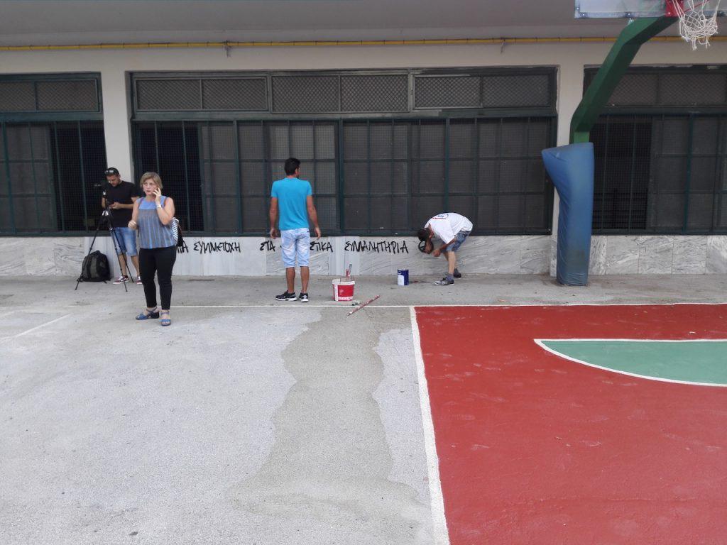 Μαζί με την προσωπική μου… απελπισία θέλω να πω ένα μεγάλο μπράβο στους καθηγητές, τους γονείς και το προσωπικό που με άμεσες ενέργειες φρόντισαν να… σβήσουν τα συνθήματα πριν την είσοδο γονέων και μαθητών, ενώ παράλληλα καθάρισαν και την αυλή από το χαρτομάνι των βανδάλων.