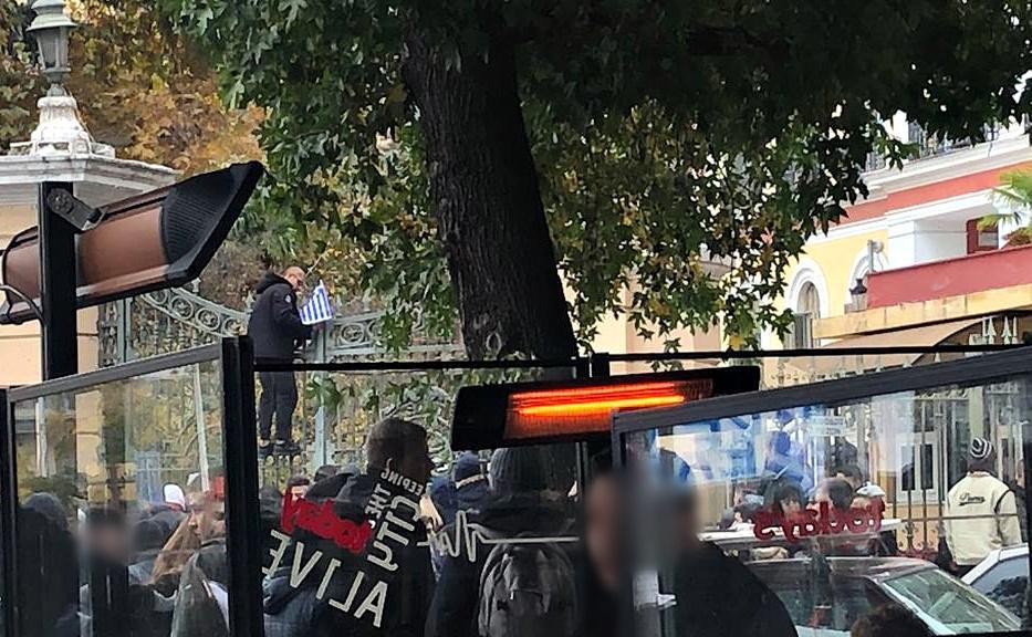 Αυτή την ώρα μαθητές σκαρφαλώνουν με τις ελληνικές σημαίες στην πόρτα του ΥΜΑΘ και πετάνε νερά και πέτρες εντός του υπουργείου: