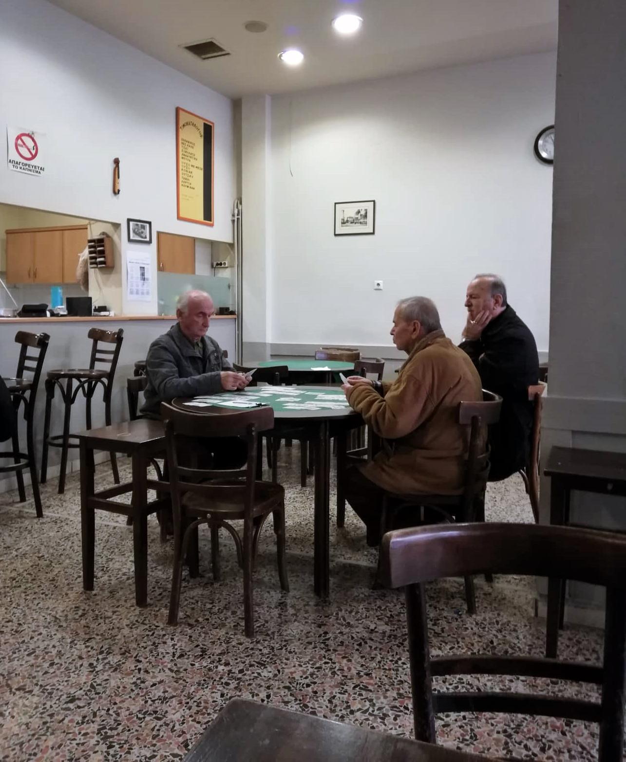 Όλοι γνωρίζονται μεταξύ τους. Μιλάνε, ενώ κάθονται σε διαφορετικά τραπέζια. Στο καφενείο είναι κάτι σαν μυσταγωγικός κανόνας να έχεις το τραπέζι σου. Είναι σαν το γραφείο σου στο σπίτι. Αν ήμασταν στη θάλασσα το τραπέζι θα ήταν το βαρκάκι του καθενός. Εκεί ο καθένας μπορεί να σκέφτεται, να χάνεται, να πίνει αυτό που θέλει χωρίς να πρέπει να συσκεφτεί με κάποιον άλλο. Αν θέλει παρέα, θα τη φέρει. Αν δεν θέλει θα σκεφτεί και να μιλήσει. Όπως ο κύριος δίπλα μου που σε μια μου ερώτηση κούνησε απλά το κεφάλι.