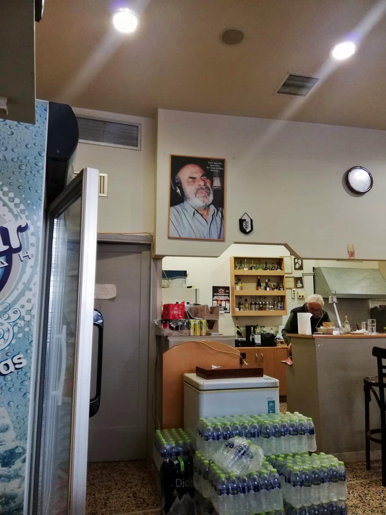 Κυριαρχεί η μυρωδιά μαγειρευτού φαγητού και πρέπει να είναι η φασολάδα που σερβίρουν μεταξύ άλλων για ουζομεζέ. Σε αυτό το καφενείο μπαινοβγαίνουν και γυναίκες, για την ακρίβεια βοηθάνε στο σερβίρισμα. Υποθέτω η γυναίκα και η αδερφή του πρώτου άνδρα. Εδώ δύο είναι οι άξονες, τα ιερά και όσια. Ο ΠΑΟΚ και ο Καζαντζίδης. Μάλιστα η φωτογραφία του Στέλιου δεσπόζει και δίπλα της κρέμεται μια σημαιούλα του δικεφάλου του Βορρά, σαν μικρό λάβαρο. Οι θαμώνες σήμερα είναι ήρεμοι και δεν μιλάνε για μπάλα. Η ισοπαλία με το γαύρο τους χάλασε. Αδιάφορη. Η νίκη θα τους είχε μεθύσει με χαρά και σήμερα θα έπιναν μια ρετσίνα παραπάνω. Η ήττα θα τους έκανε να διαμαρτύρονται με δυνατή φωνή, να τρώγονται με τα ρούχα τους και να βρίσκουν λάθος την ποσότητα ζάχαρης στον καφέ.